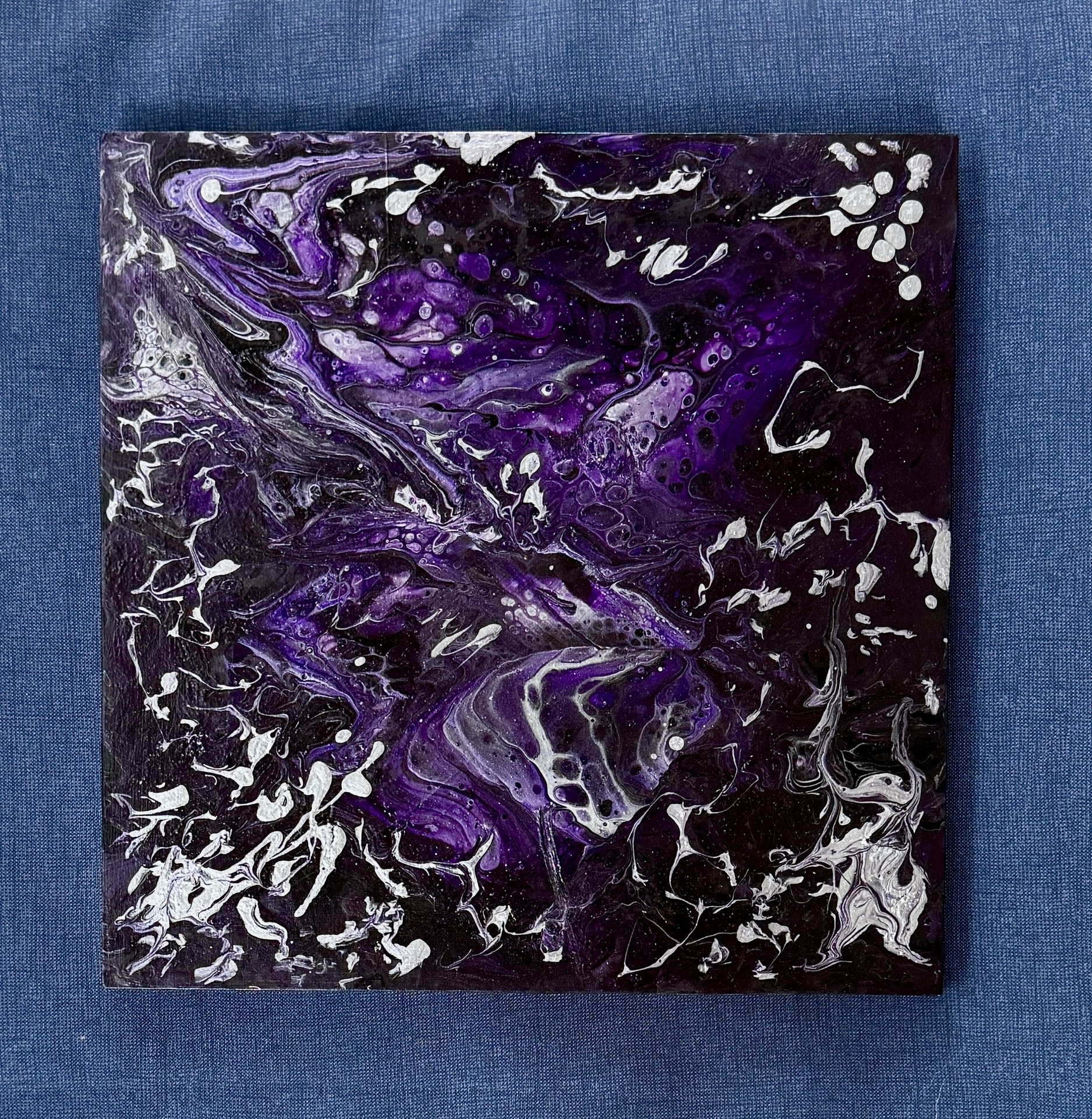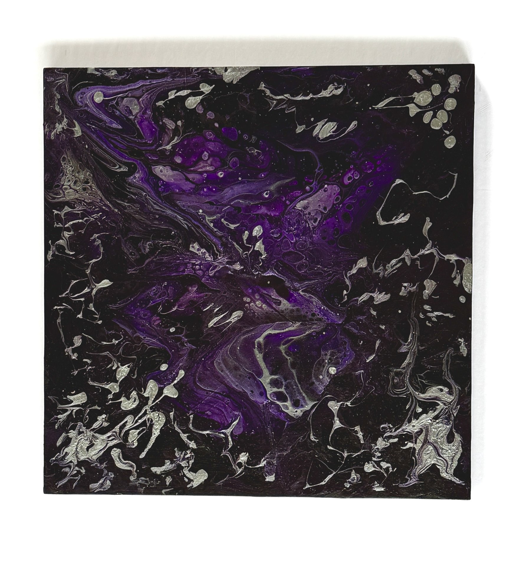 An acrylic fluid pour using the colors of my favorite stones……Amethyst and Onyx.  Added some silver designs as accents.  On 12” x 3/4” square birch wood. Painted black on the sides and ready to hang. Painted is signed and also sealed for protection.