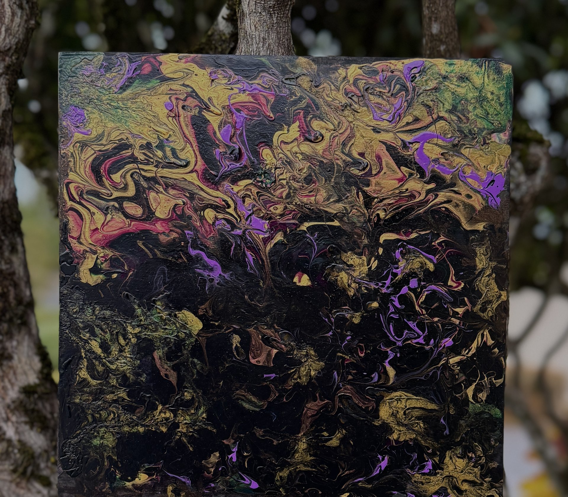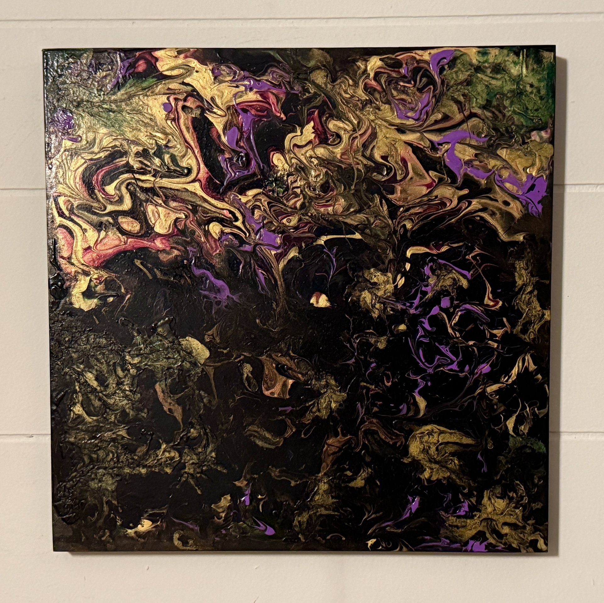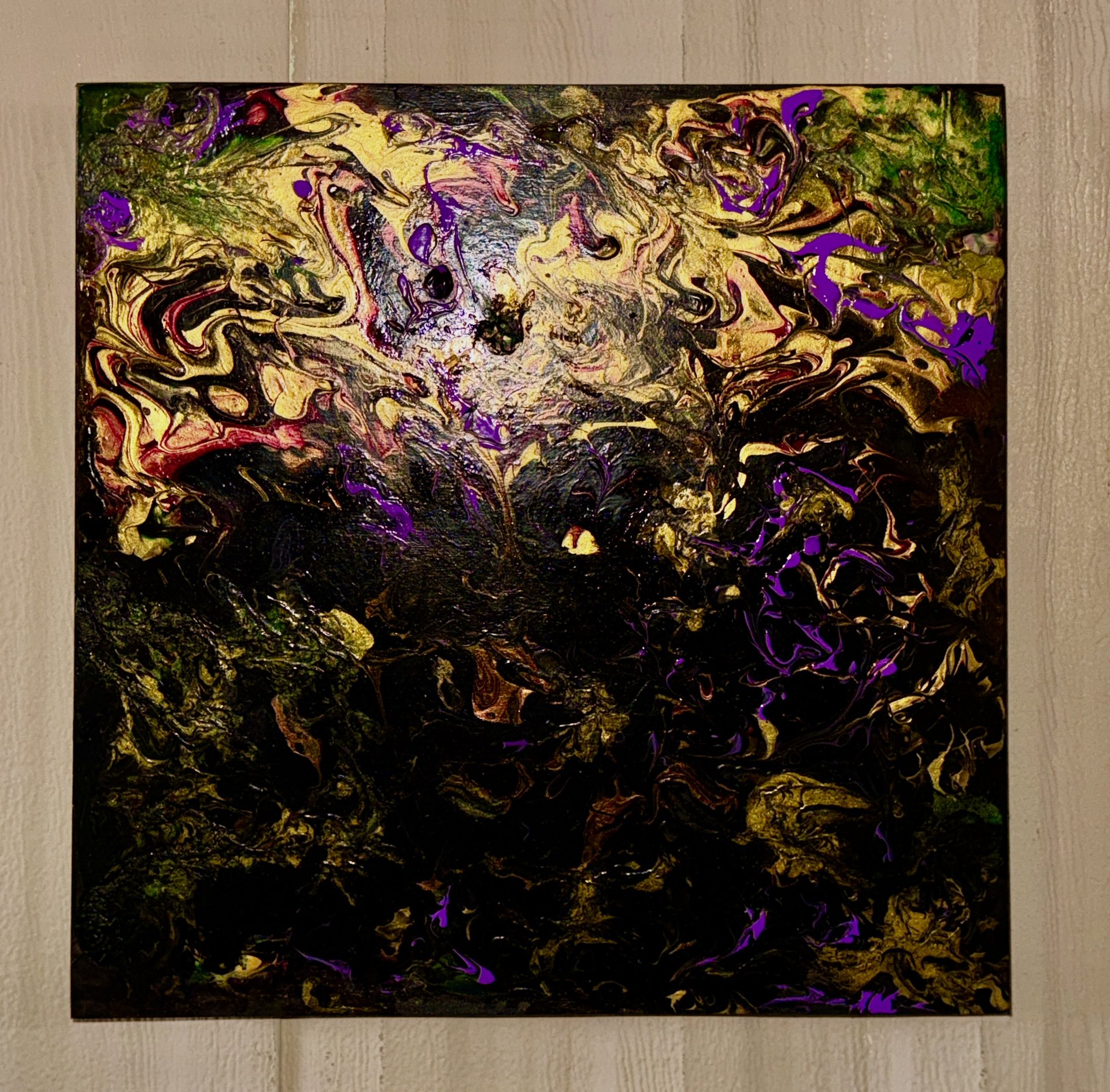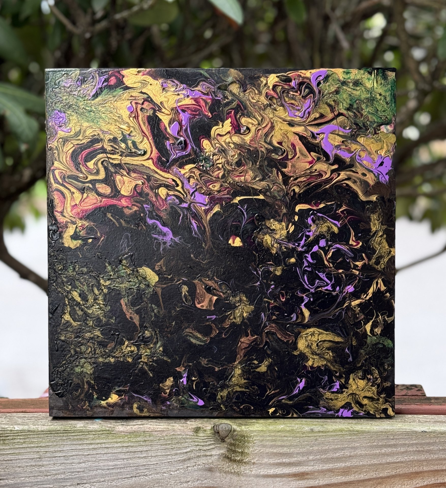 Bright flowers still shine within the darkness of a midnight garden. The continual battle of dark vs light! Acrylic fluid art painting on 12” square x 3/4” wood board. Painted black on the sides and signed & sealed for protection so ready to hang.