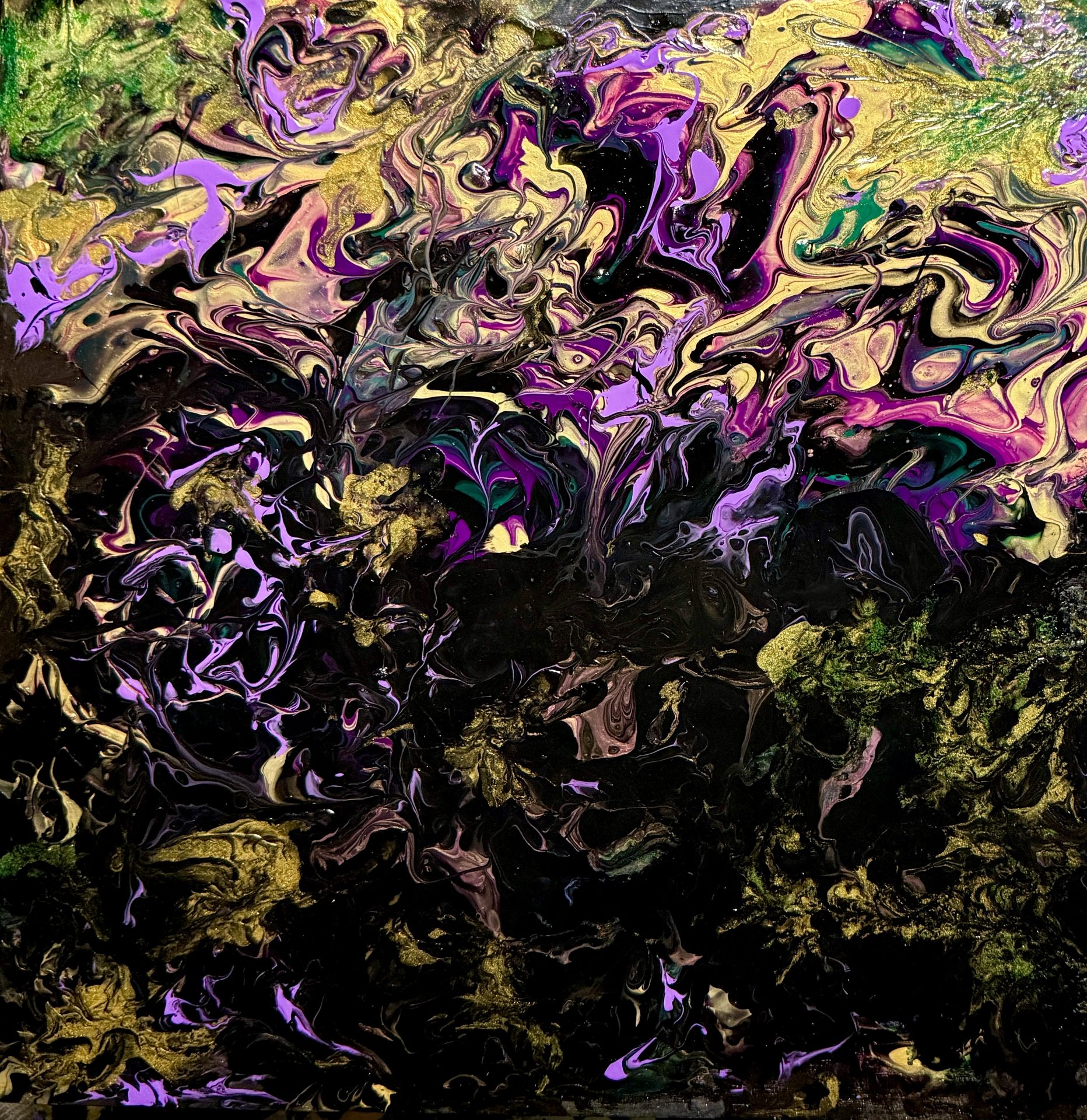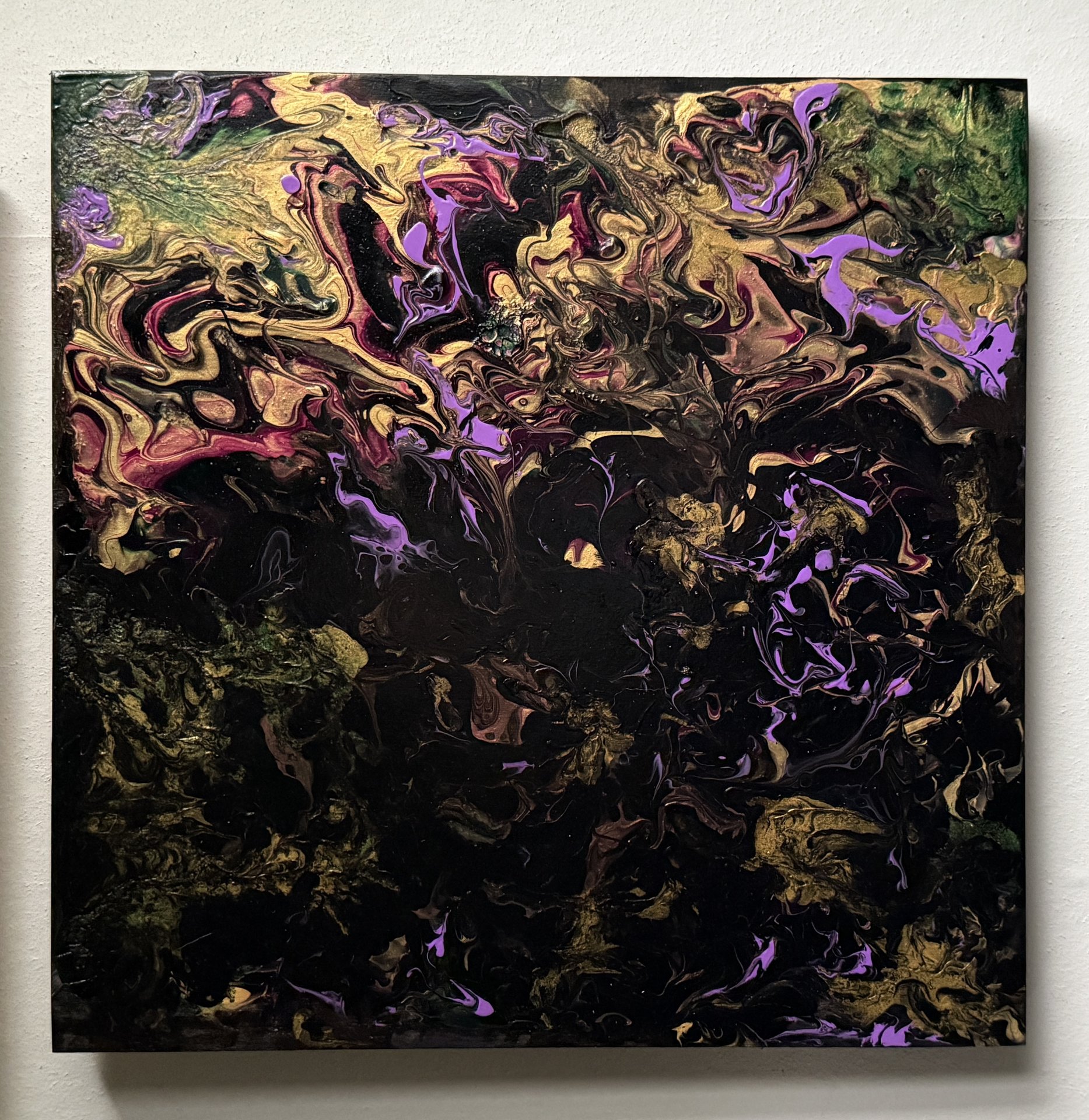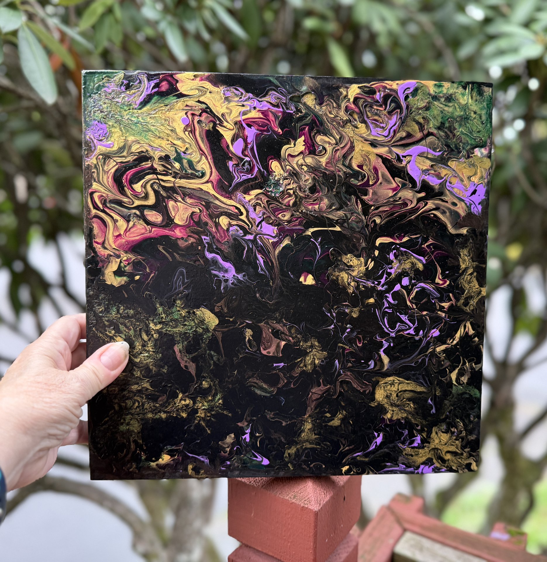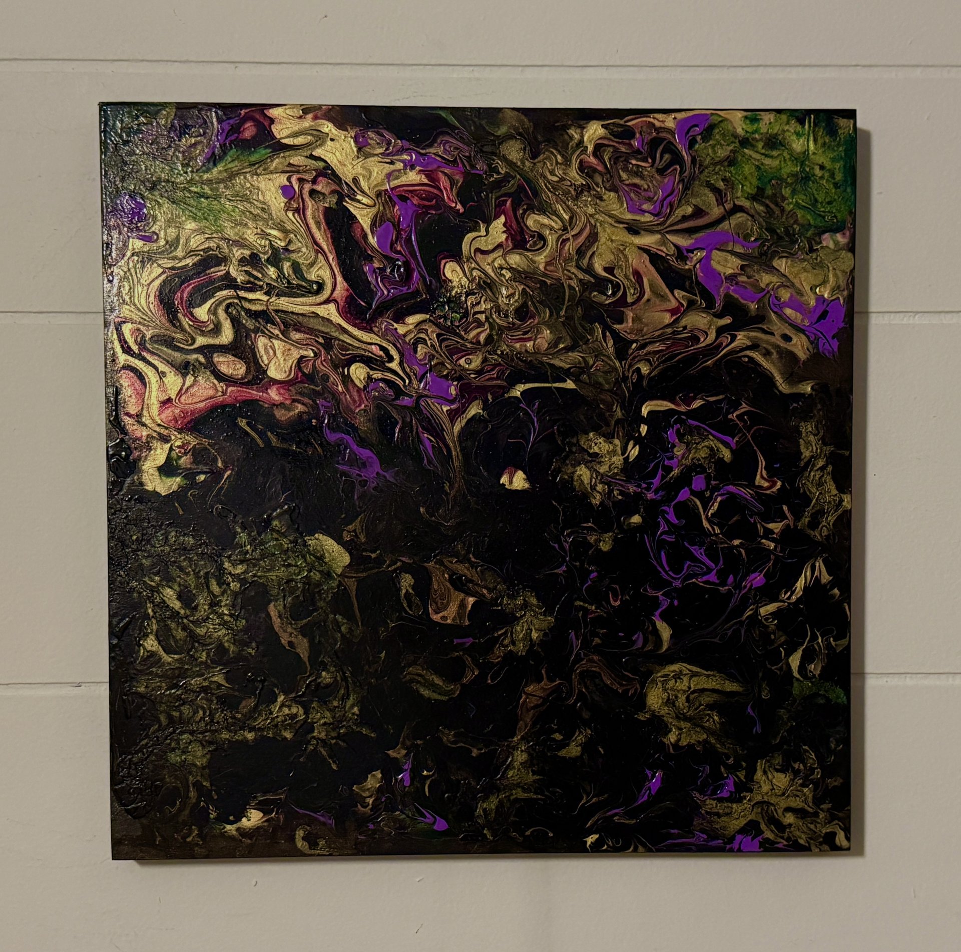 Bright flowers still shine within the darkness of a midnight garden. The continual battle of dark vs light! Acrylic fluid art painting on 12” square x 3/4” wood board. Painted black on the sides and signed & sealed for protection so ready to hang.