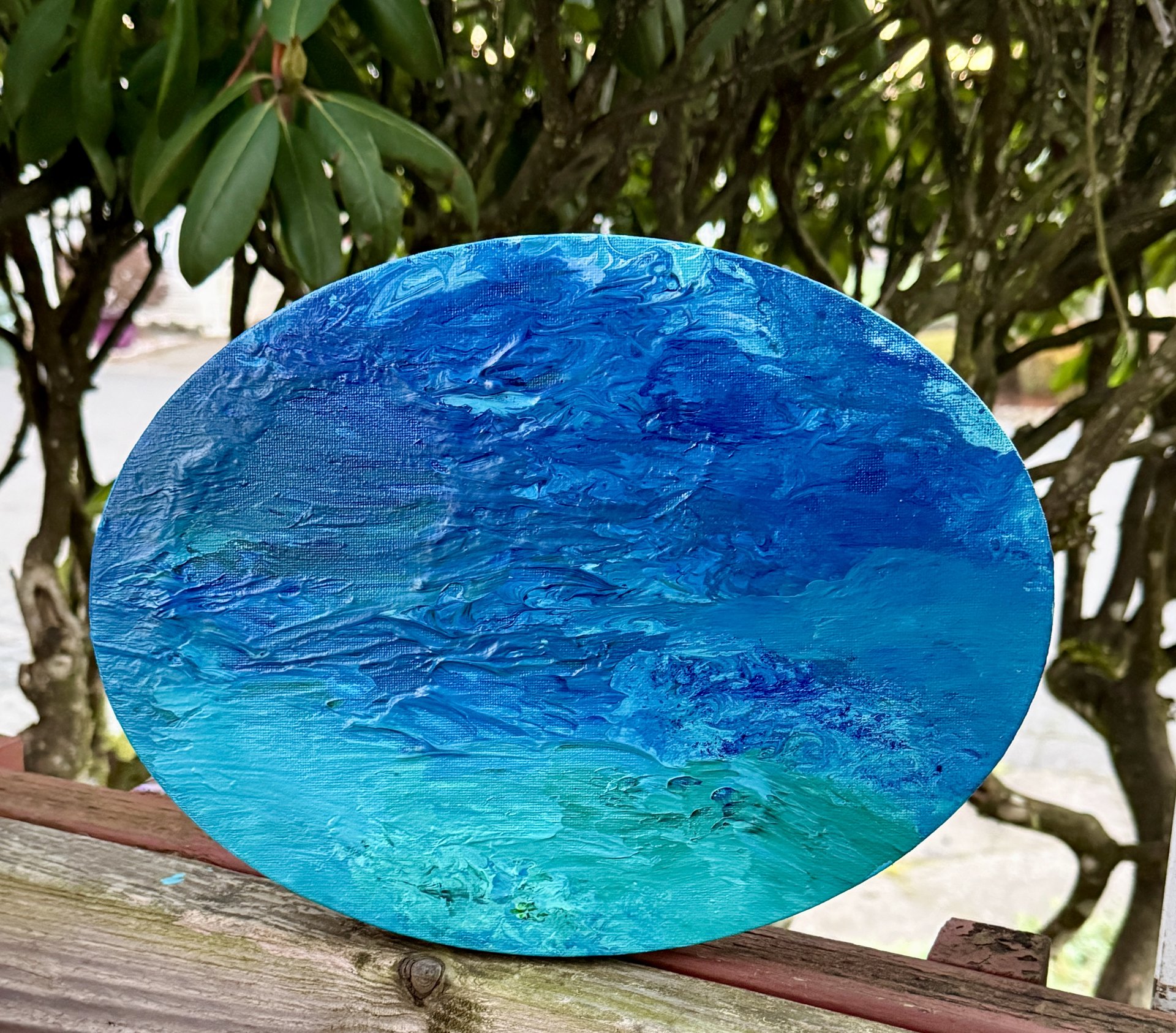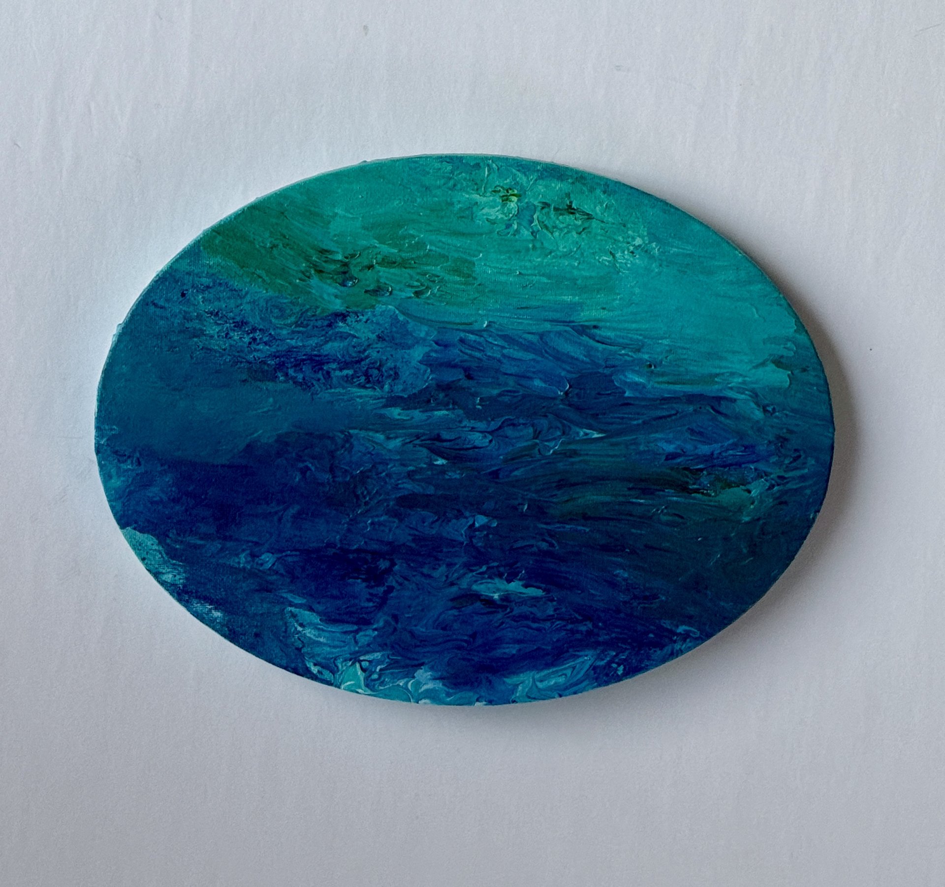 “Beneath the Turquoise Surface” inspired by my love of blue stones, especially the beautiful colors of Turquoise stones and pretty blue water. Acrylic fluid art on 9” x 12” x 3/4” stretched oval canvas. Painted on the sides and ready to hang. Signed and sealed for protection.