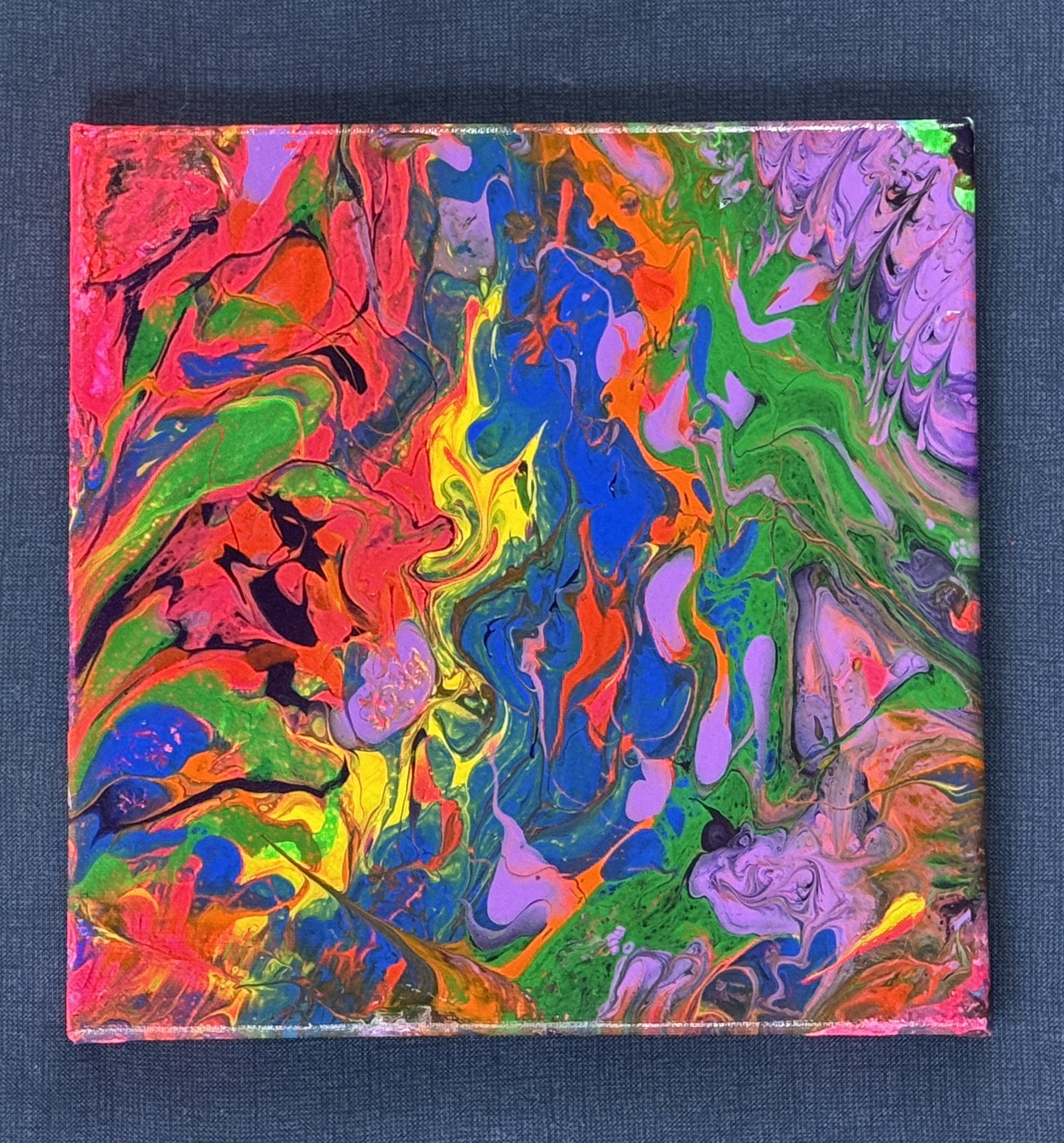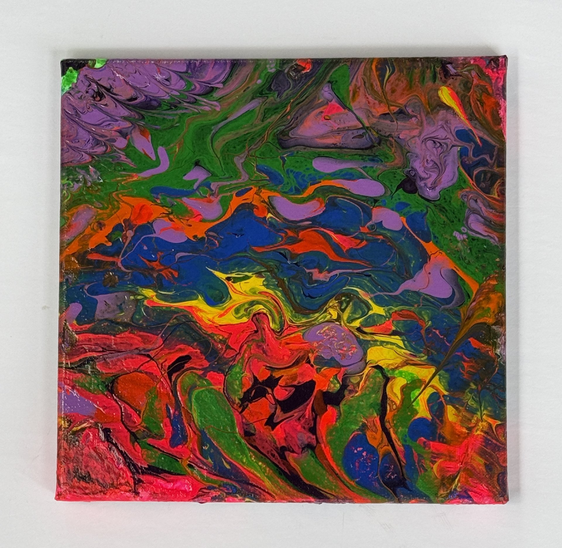 I named this abstract acrylic “THE BIG DISTRACTION” because this is where we’re at! A disgusting show of sword rattling by small men to distract from every other disgusting thing going on!!!!! Painted with acrylics on 8” square stretched canvas, signed and sealed with semi-gloss sealant.