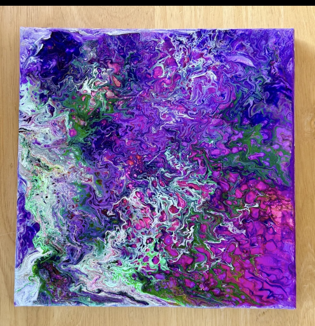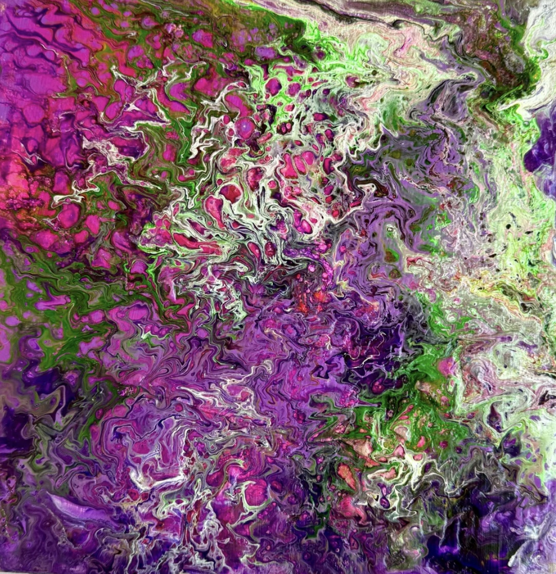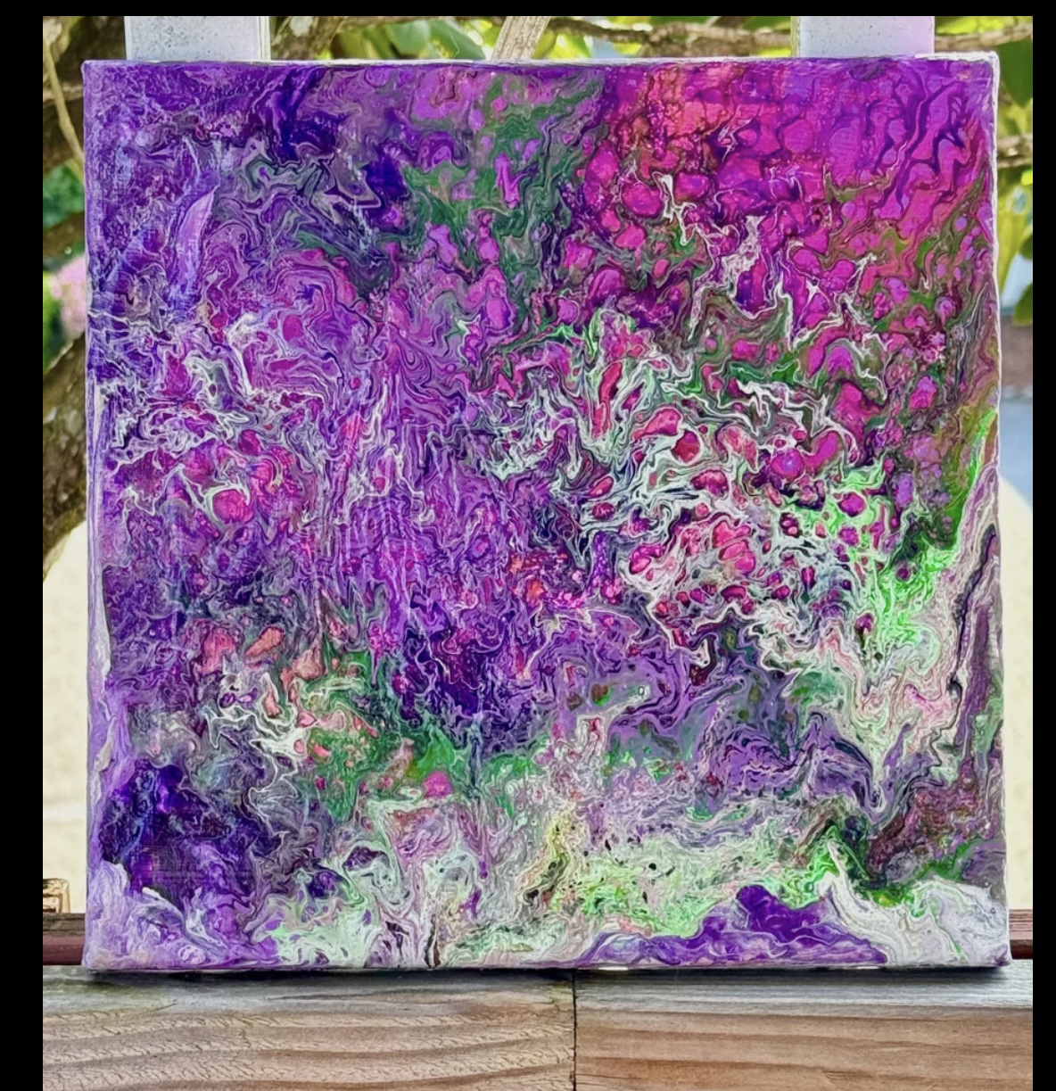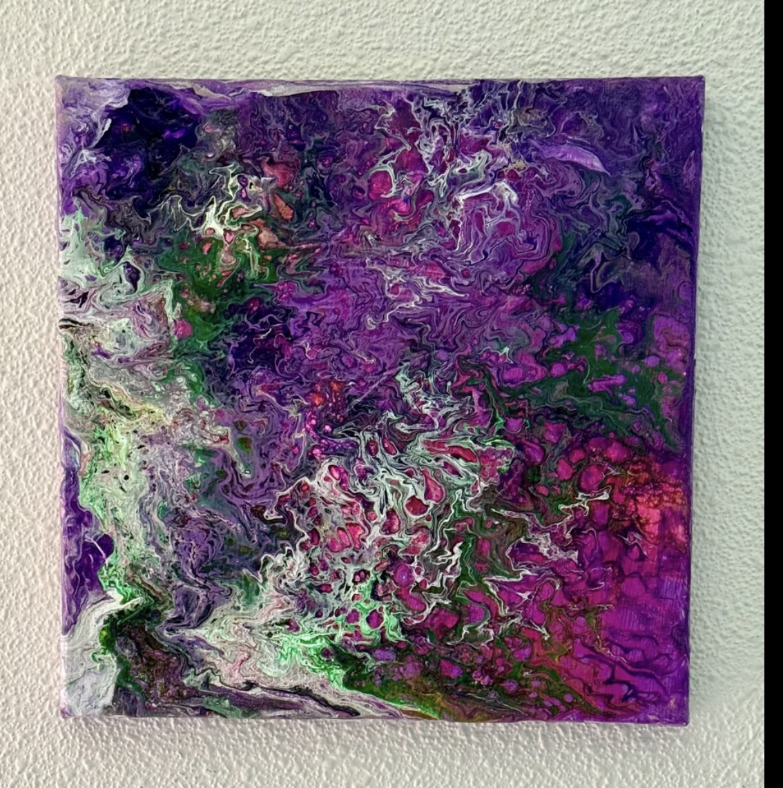 Fluid Art acrylic abstract on 10” square, 3/4” thick canvas stretched on wood. I wanted this to look like all the flowers everywhere coming up to greet spring. Took a lot of pouring & tilting to get the look I wanted! Painted on the sides so it’s ready to hang. Sealed with UV protection sealant. Painting is signed and dated.