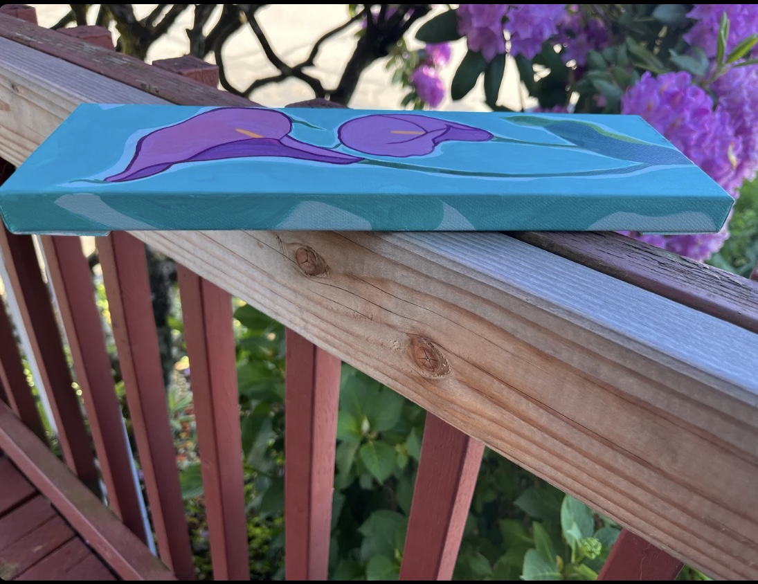 Beautiful Calla Lilies inspired by my plants. An original painting by me using acrylic paints on a narrow rectangular gallery wrapped canvas stretched on wood. Perfect for that smaller space! She measures 4" x 12" x 3/4". I added an abstract outline around the flower for accent. Canvas was also painted on sides (see last photo) in an abstract pattern making it ready to hang (no frame required). Sealed with UV protection sealant. Painting is signed.