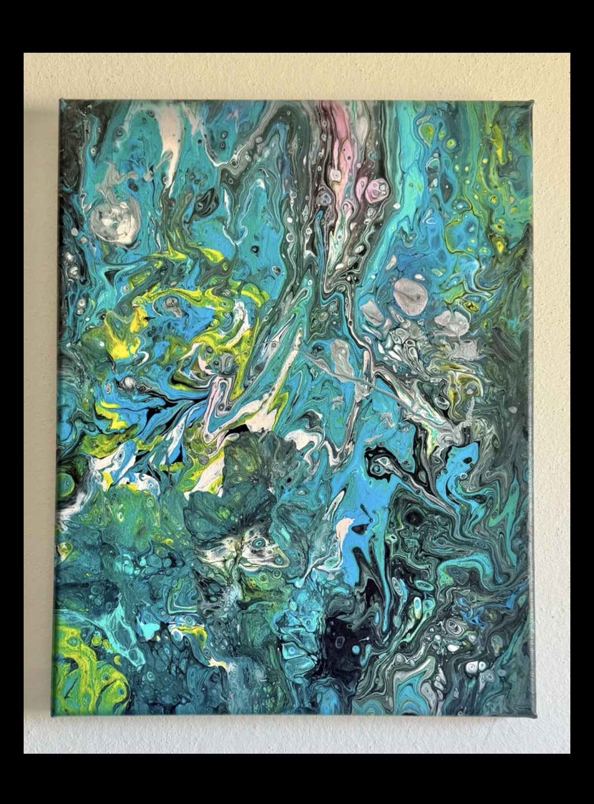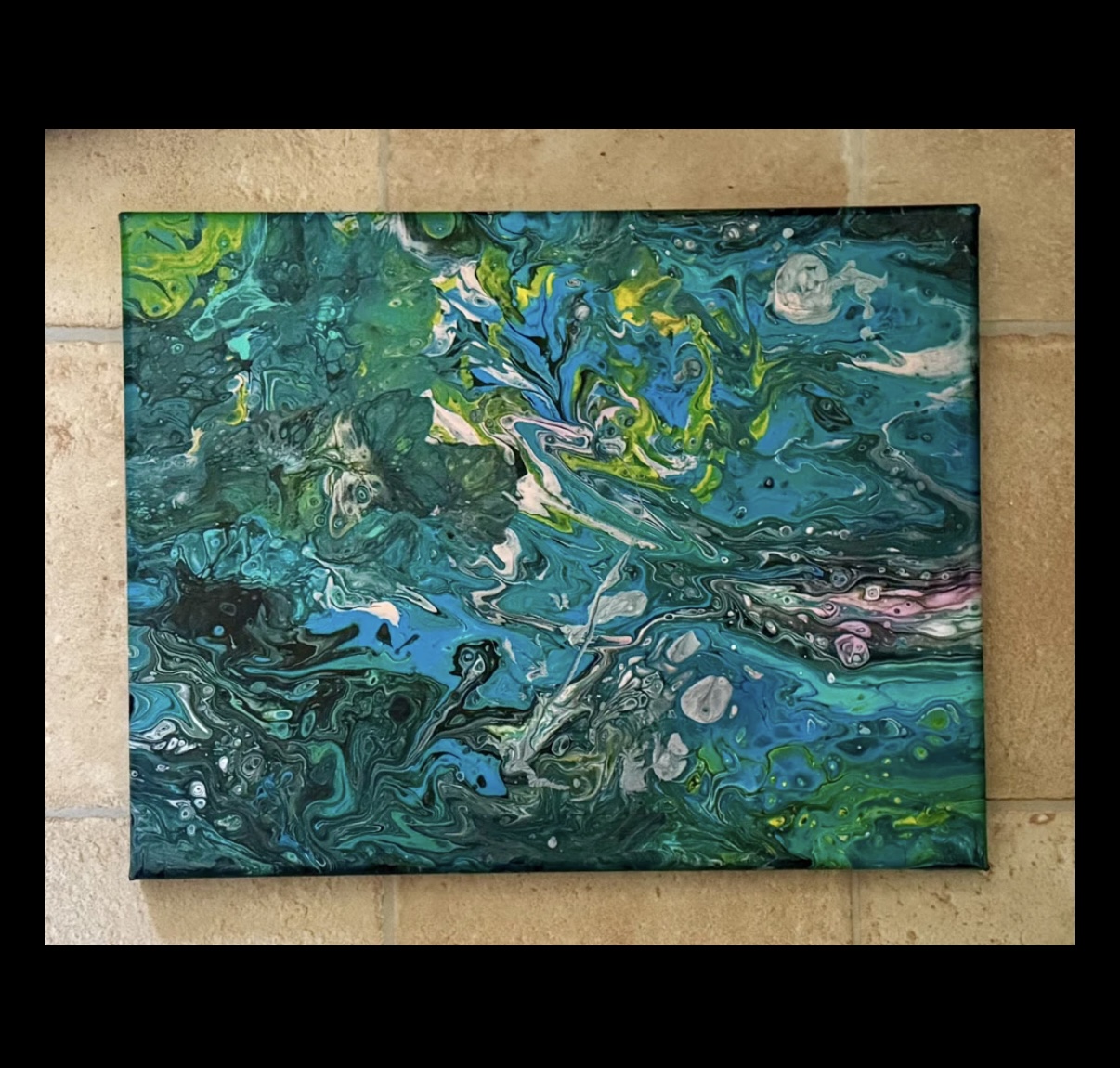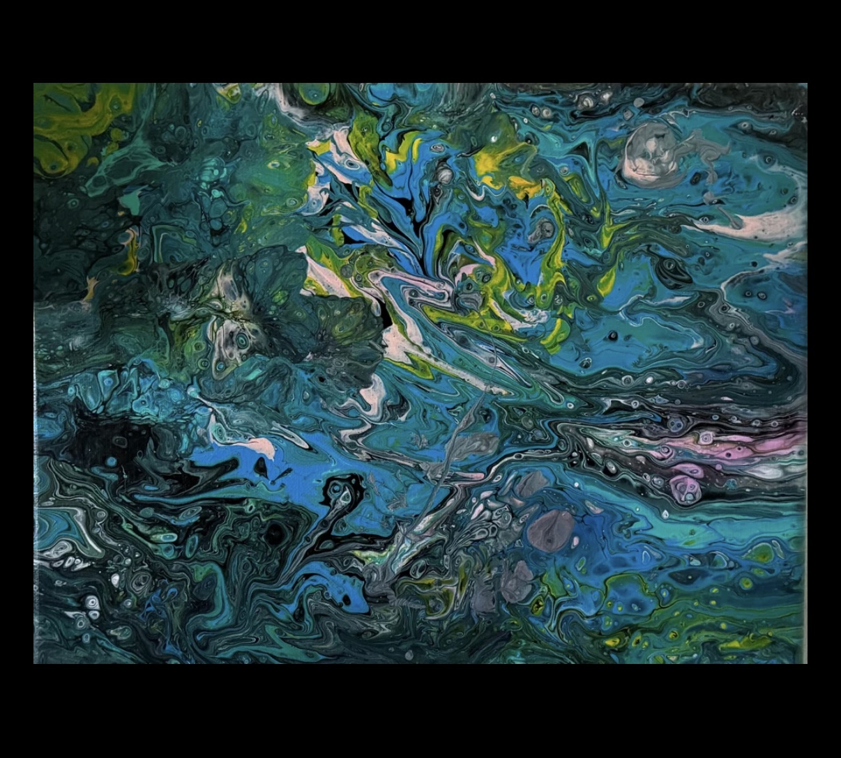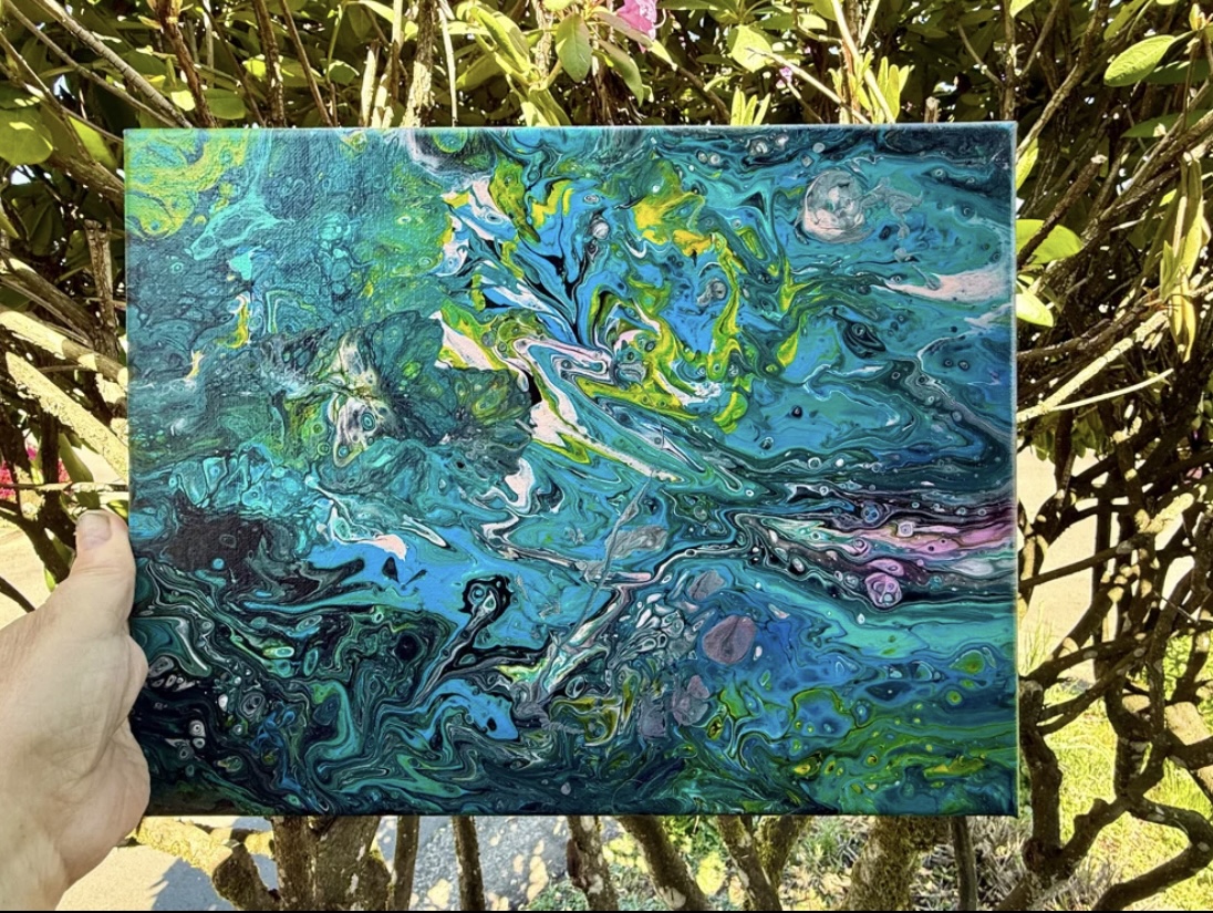 “FUN UNDERWATER” an original acrylic fluid art painting on 11” x 14” x 3/4” stretched canvas on wood. A whale just having a fun cruise through the beautiful underwater scenery. Use your imagination and you might see other cool things! Painting is painted on sides so no frame required and signed and sealed for protection.