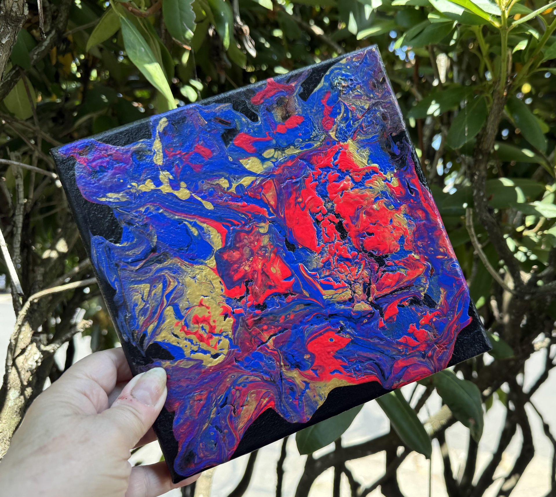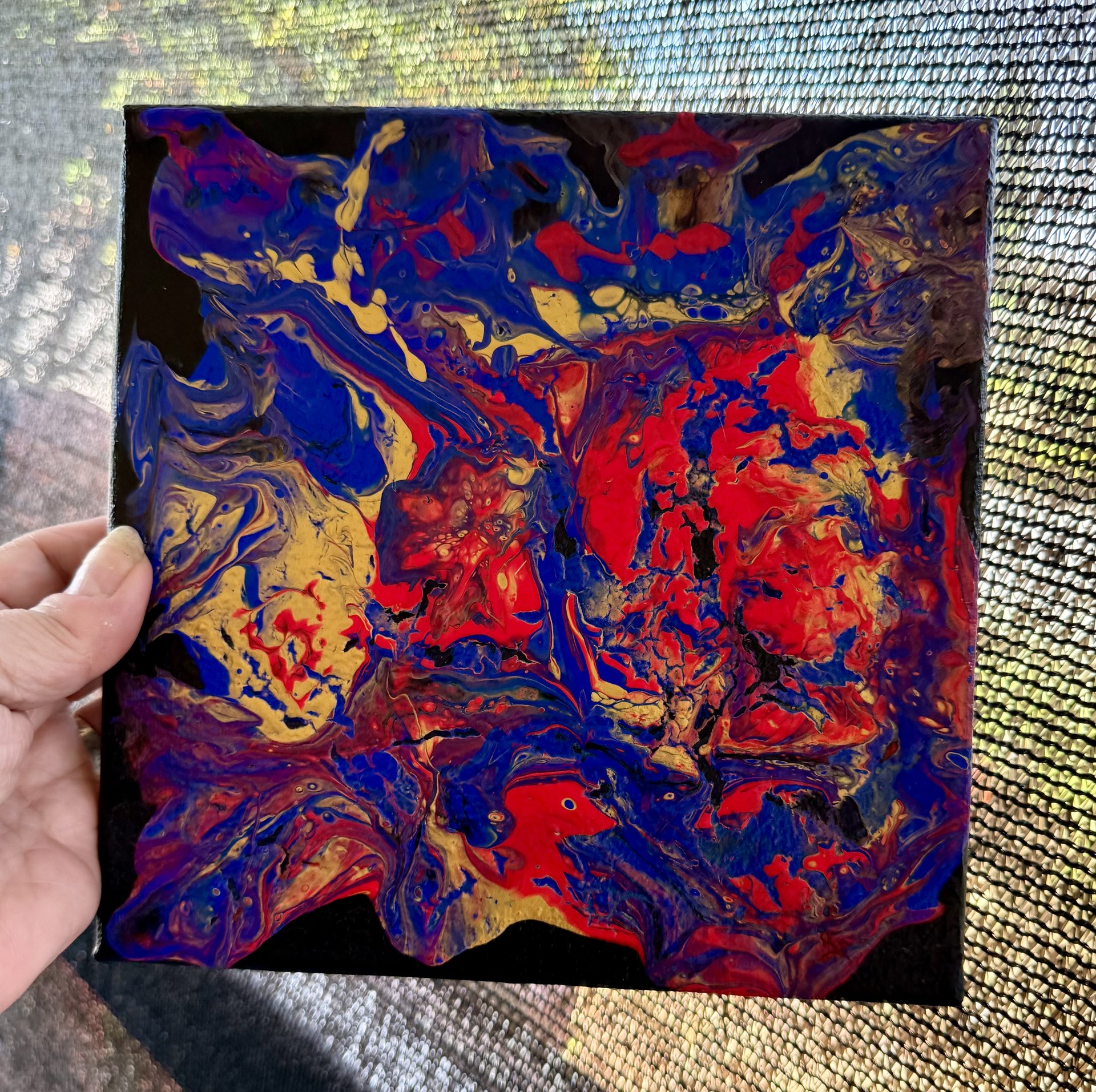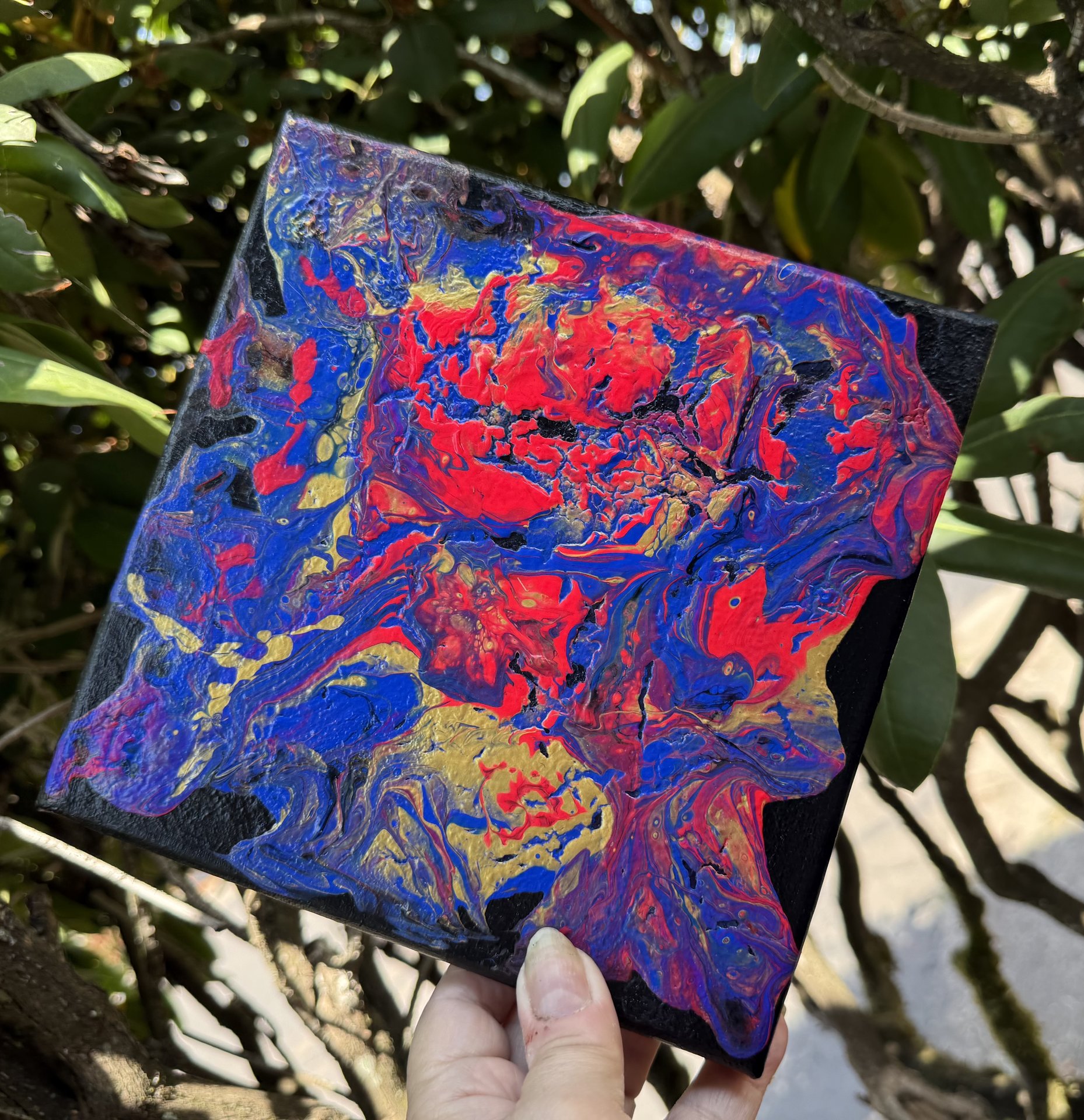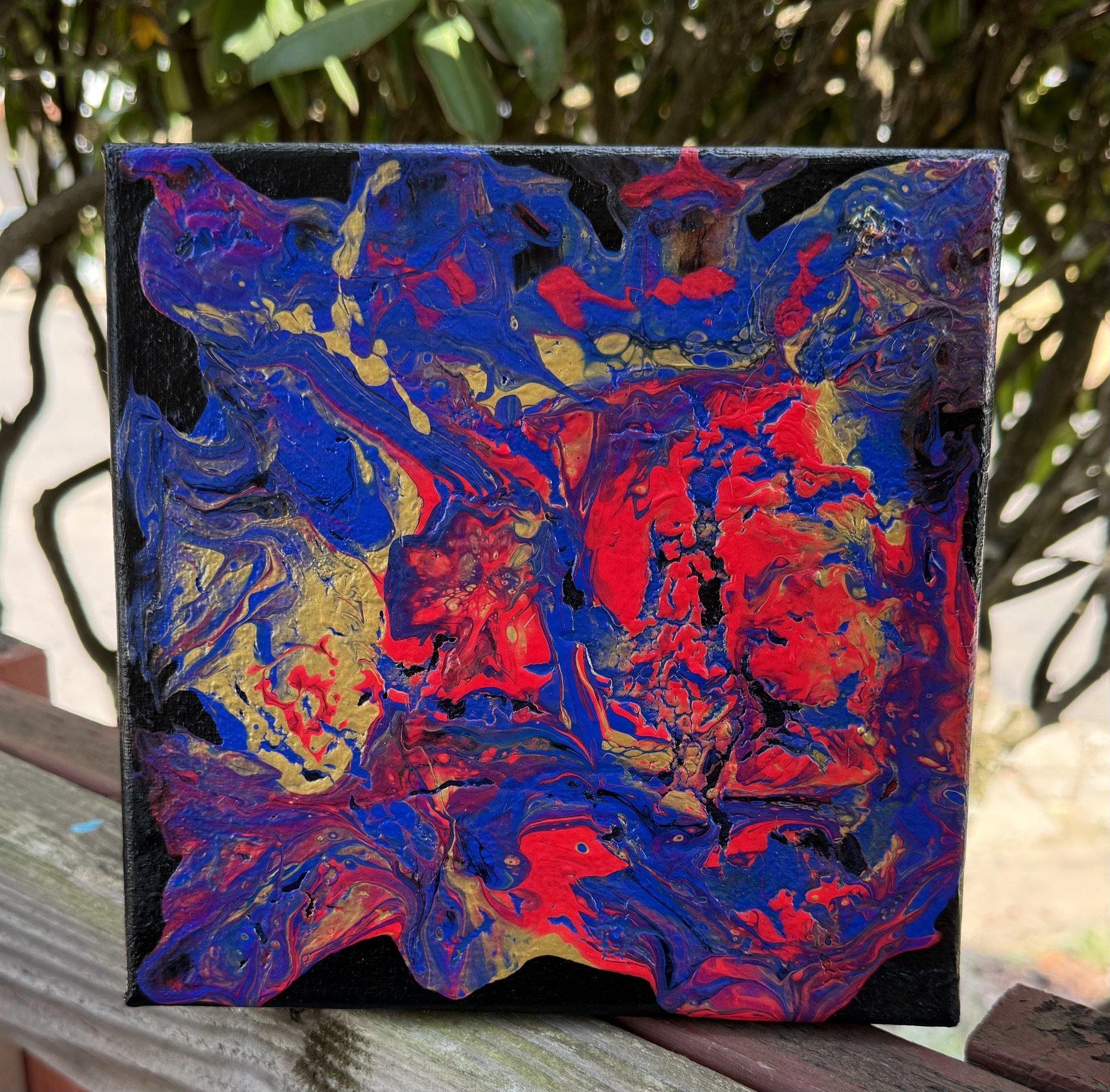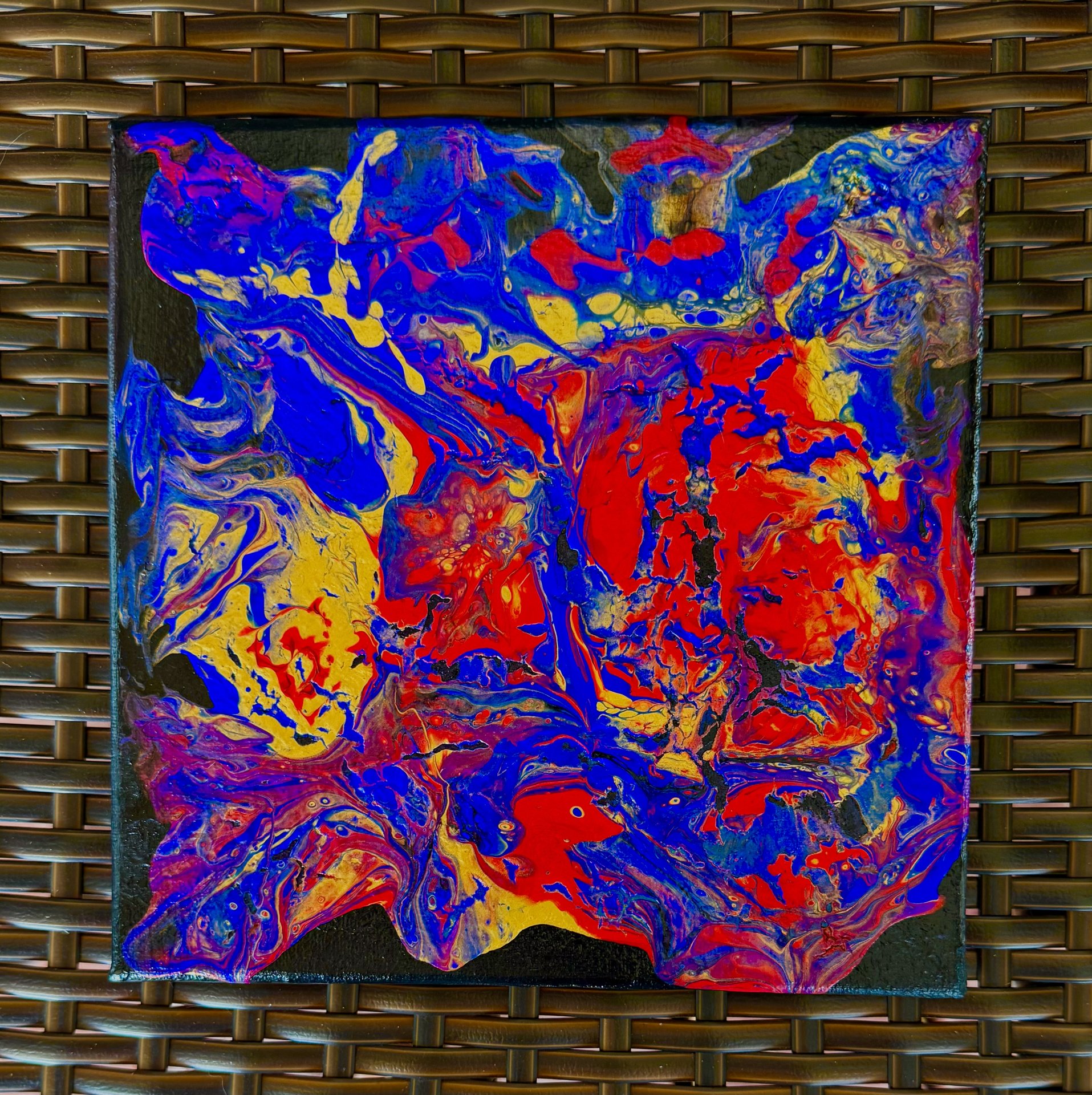 I named this abstract acrylic “Happy” because it makes me smile when I look at it. A sweet pop of color for a small space as she is painted on an 8” square canvas.