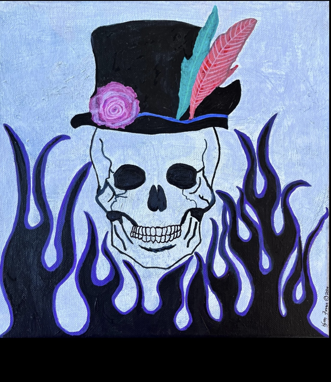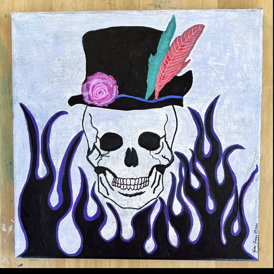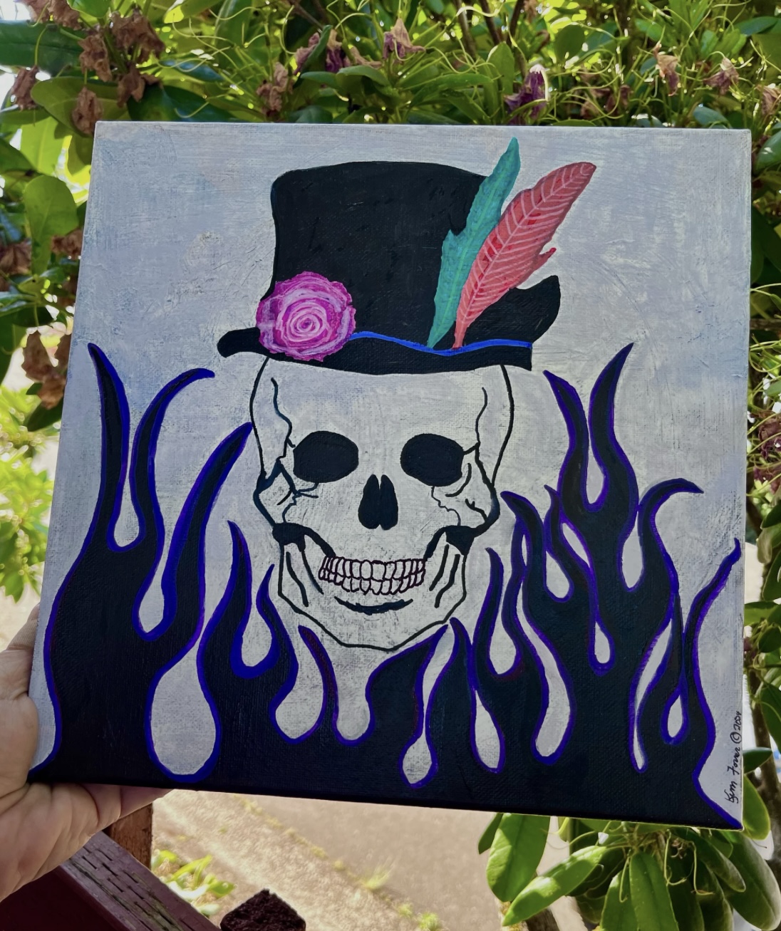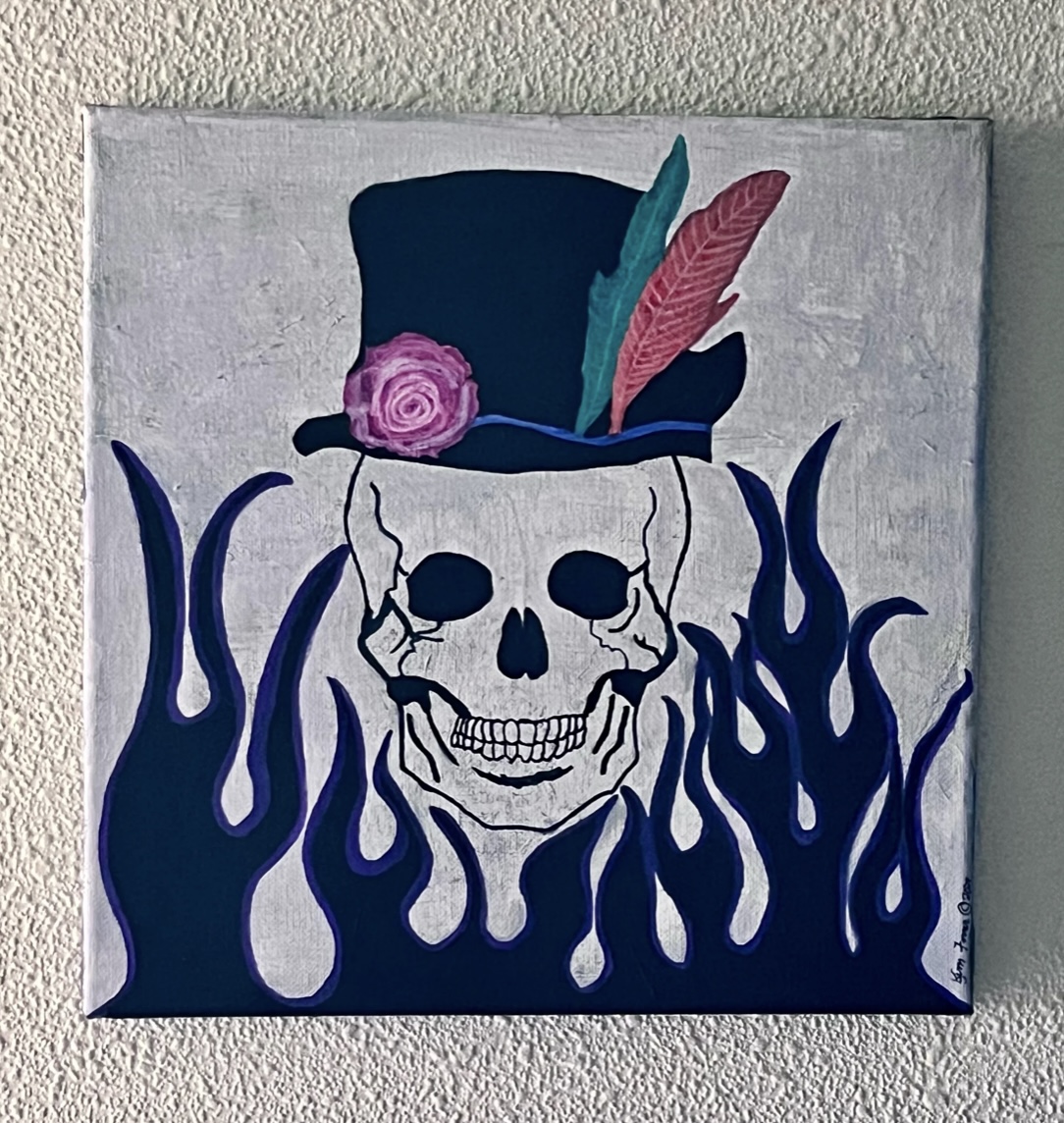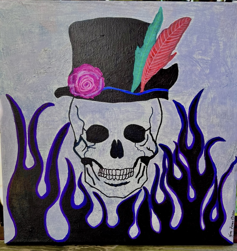 "Let's Party!" An original painting using acrylics on canvas. I gave it a watered down look on the blue background and skull to look old. The flames were outlined in violet which is the hottest flame color. And this handsome gentleman is definitely the "life" of this party! Measuring 12" x 12" x 3/4". Painted black around the sides so ready for hanging. Sealed with UV protection sealant. Painting is signed.