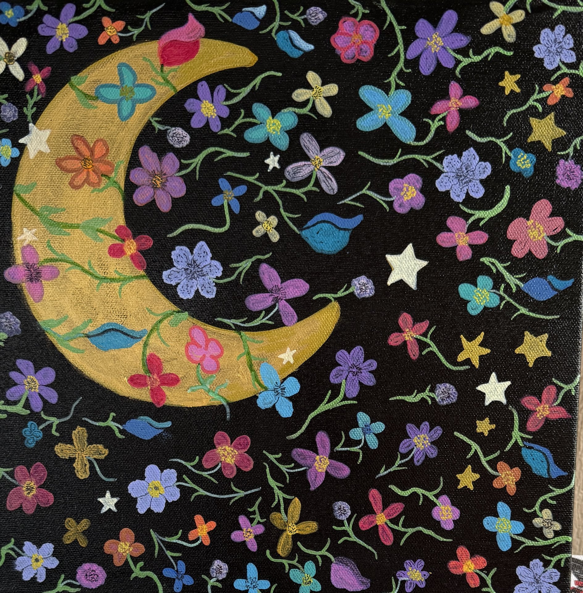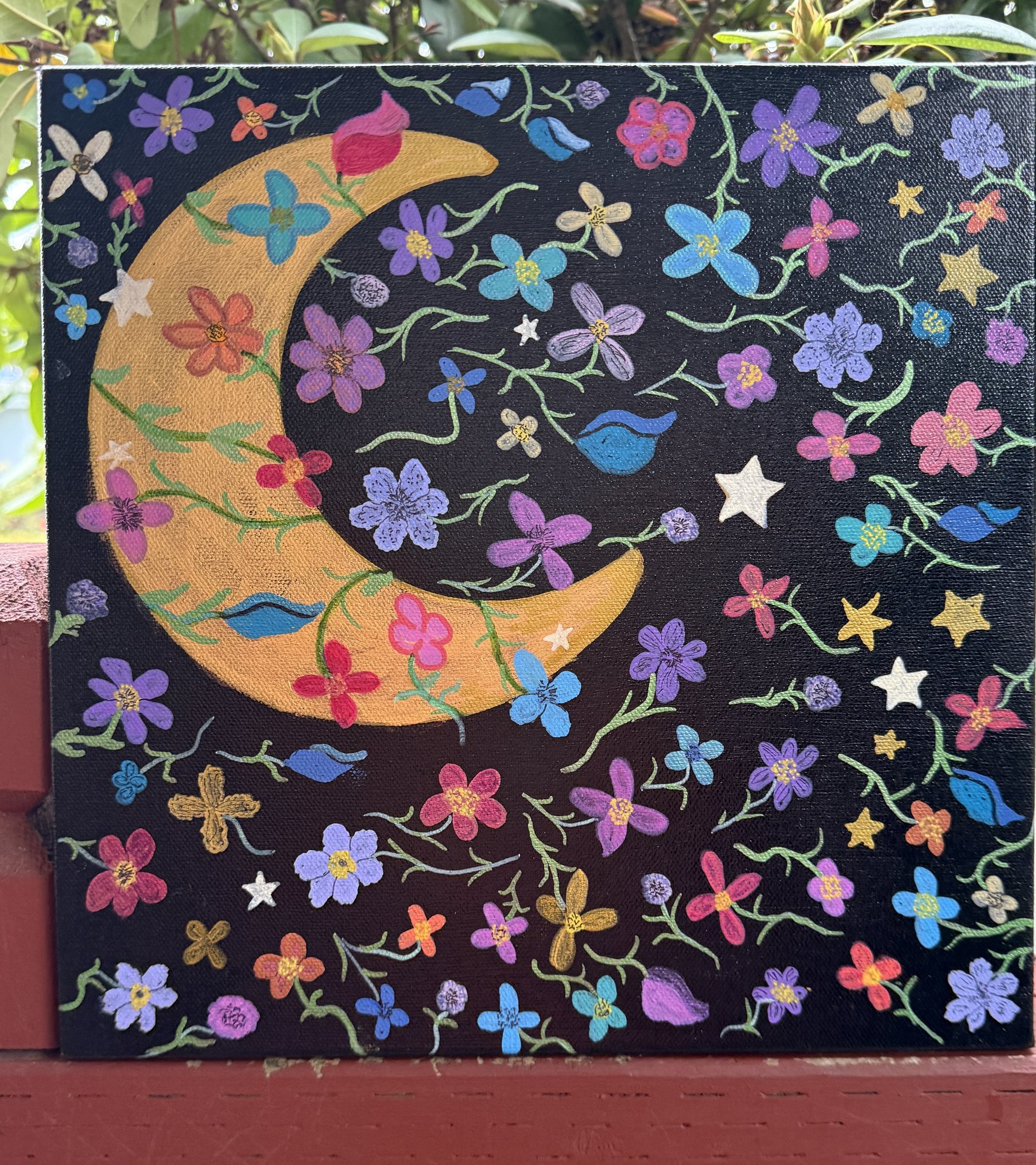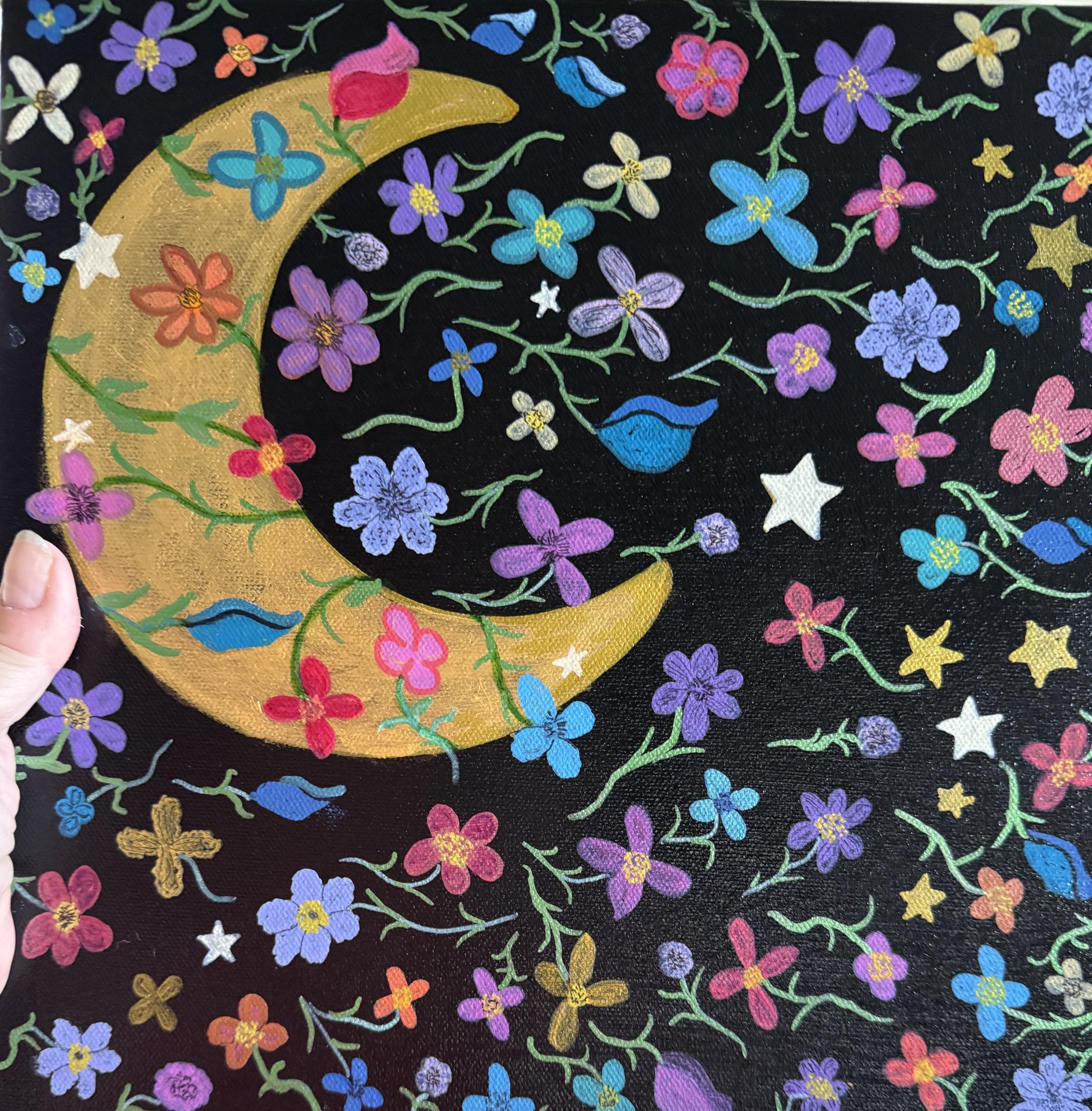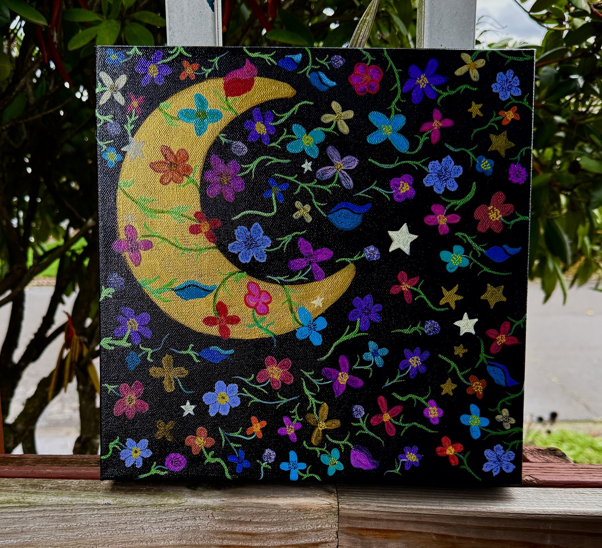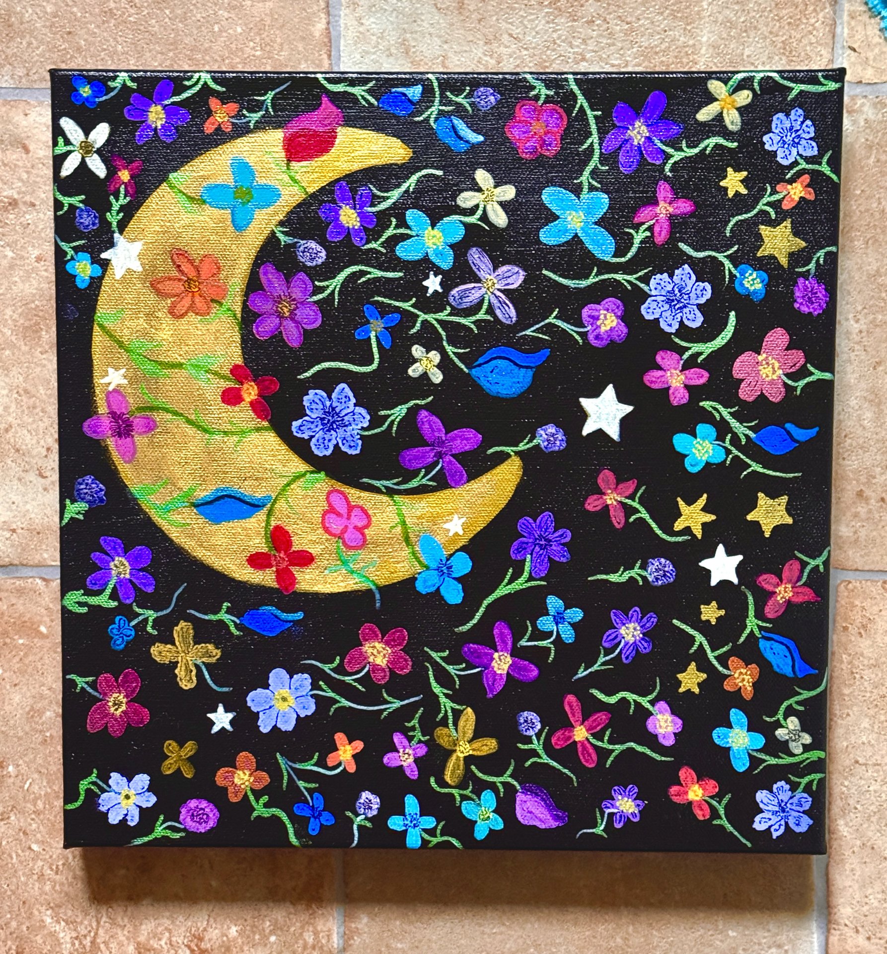 Magical and colorful wildflowers floating and vining around the moon from a mythical garden. Definitely a garden I’d like to be in! Acrylics on a 12” square x 1-1/2”. Painted on the sides and ready to hang! Painting is signed and sealed for protection.