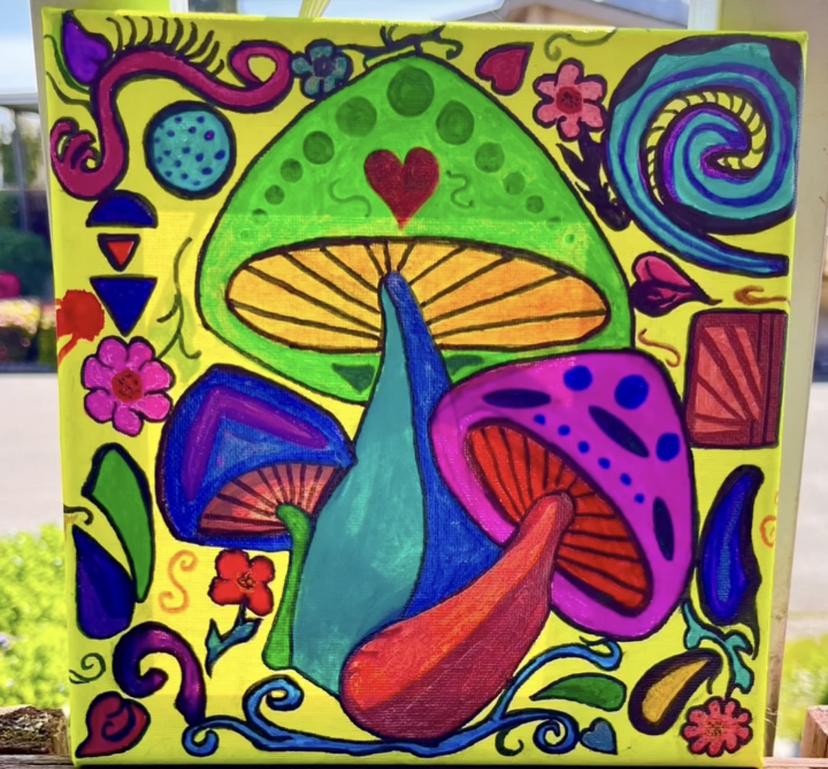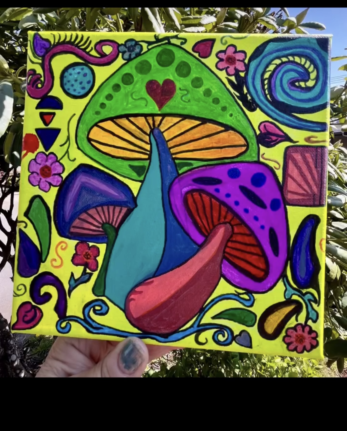 Tripping in the garden of Magic Mushrooms. An original painting using both acrylics and neon acrylic paint on canvas stretched on wood. Measuring 8” x 8”. Canvas was painted on sides and some surprise little details added, making it ready to hang (no frame required). Sealed with UV protection sealant. Painting is signed. Inspired by all the colorful psychedelic posters and album covers of the 60s and 70s and of course….Alice in Wonderland.