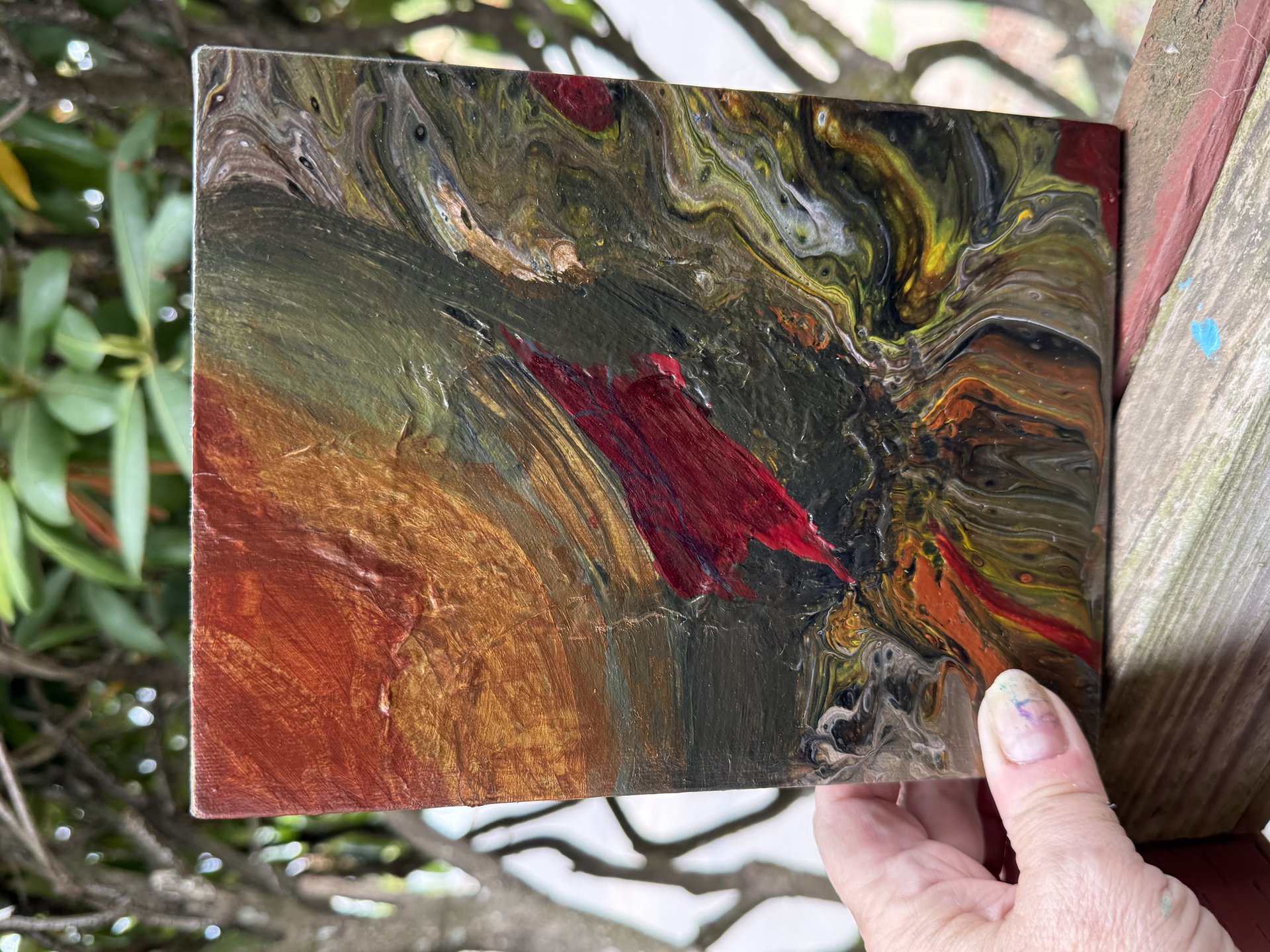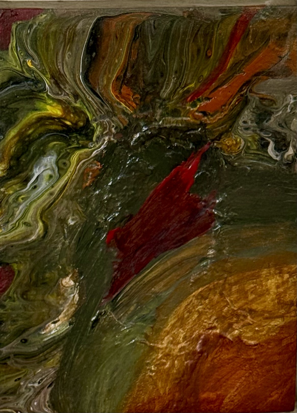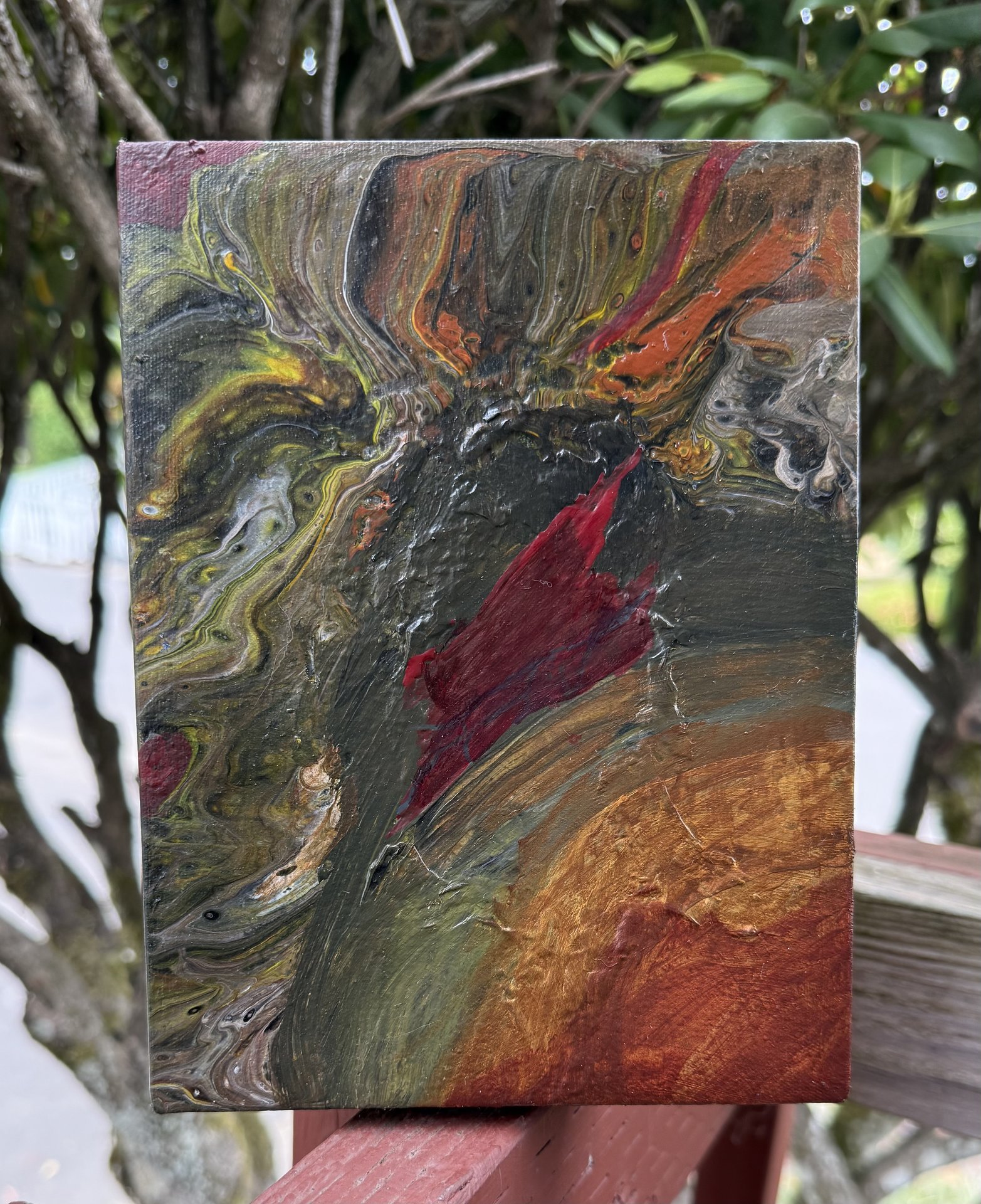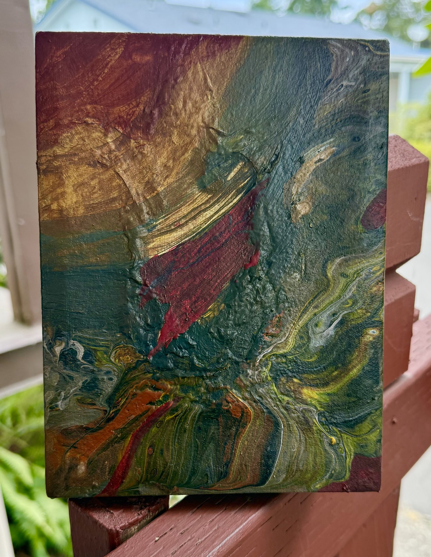 A smaller painting, using acrylics on a 6” x 8” x 1” canvas on wood. Painting is signed and sealed with semi-gloss sealant. Painted on sides and a sawtooth hook on backside for hanging.