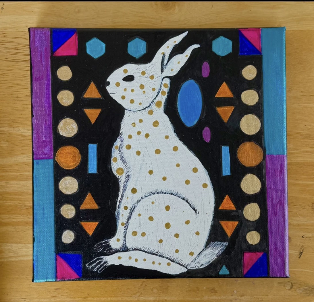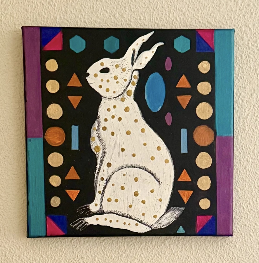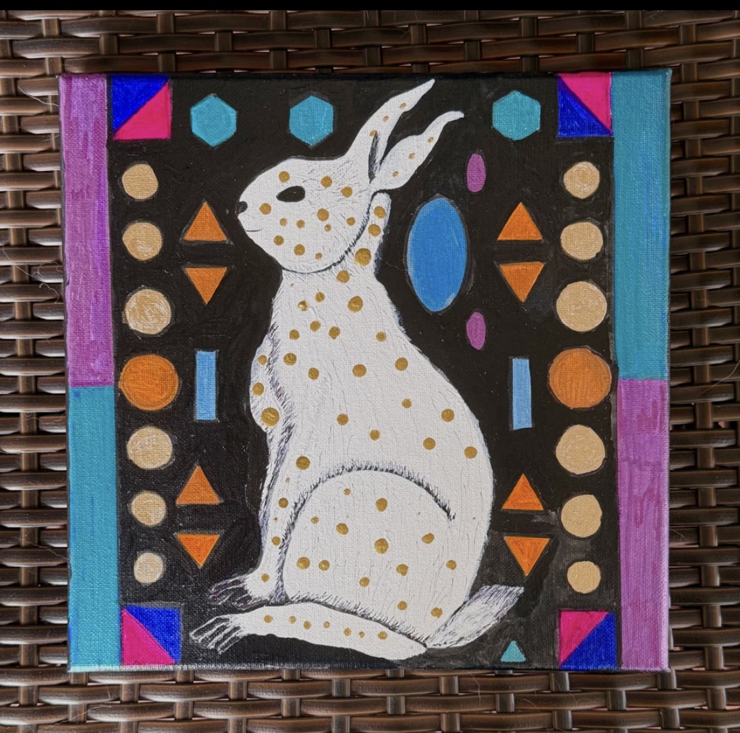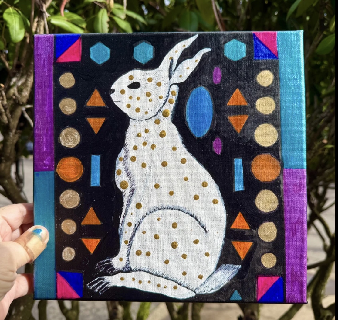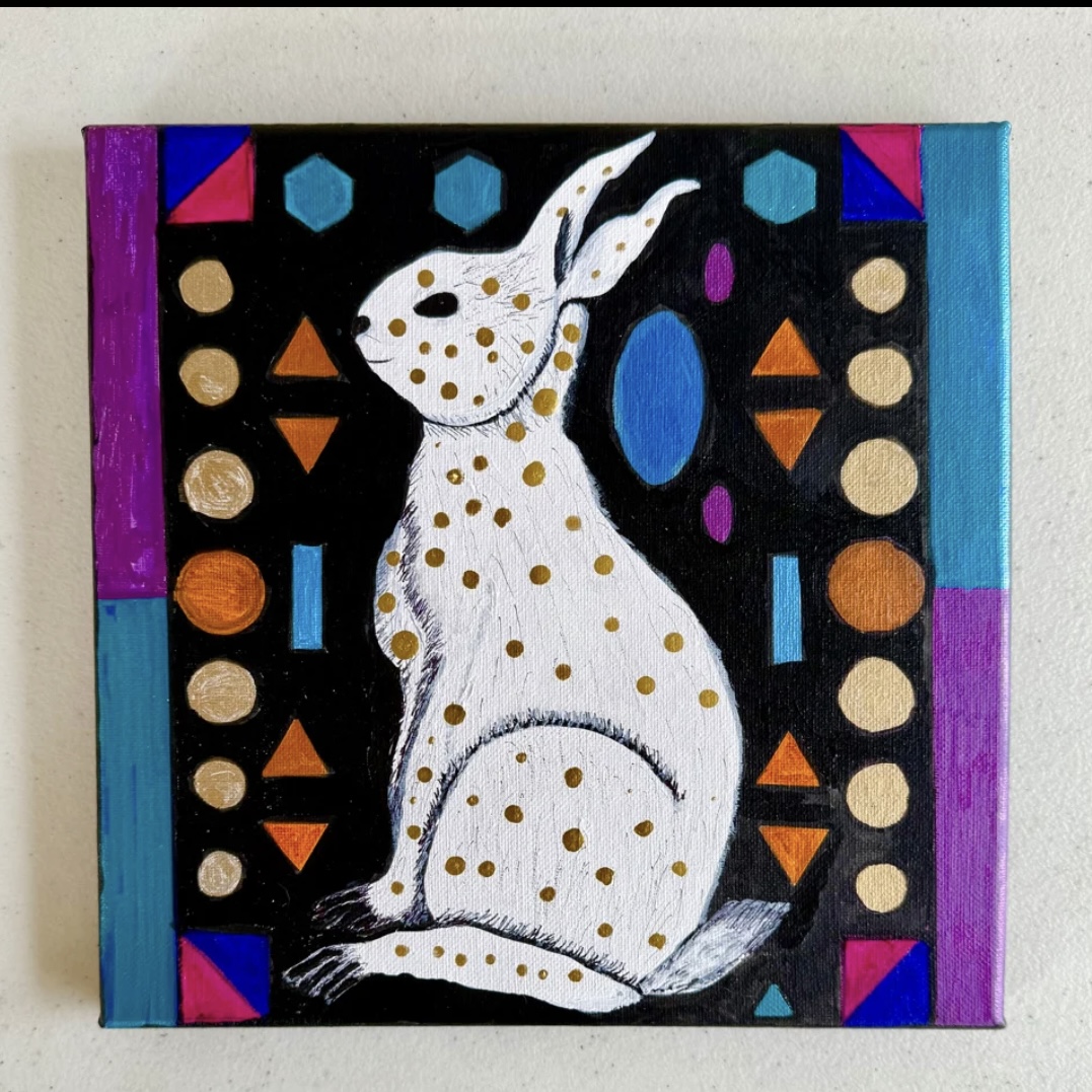 He’s a classy rabbit with gold ink polka dots! Original acrylic on 10” x 10” x 3/4” stretched canvas on wood. Painted on the sides so he’s ready to hang. Sealed with UV protection sealant. Painting is signed and dated. I think he’s one of my favorites 🤎🤎🤎🤎 PAYMENT PLANS ARE AVAILABLE!