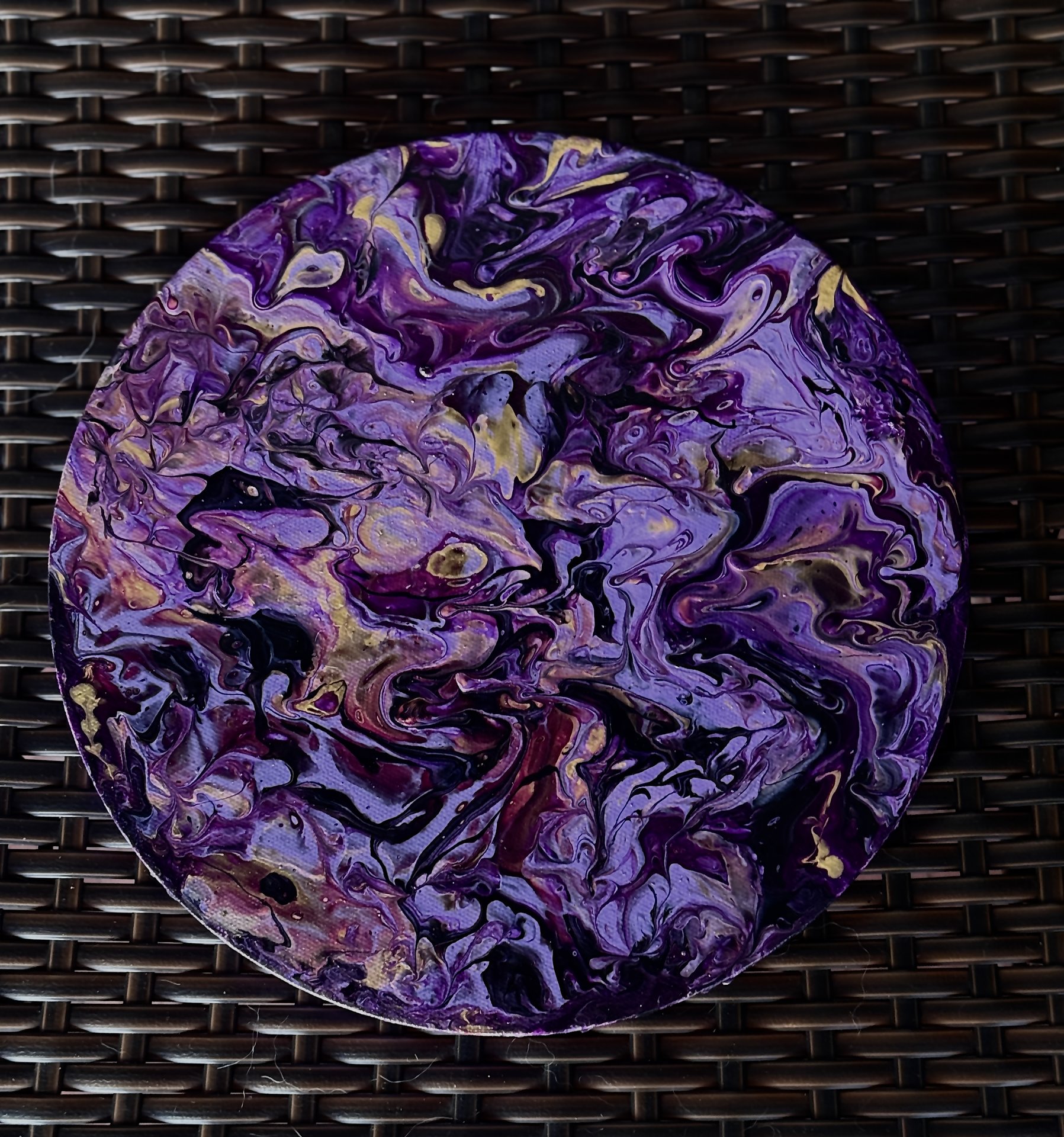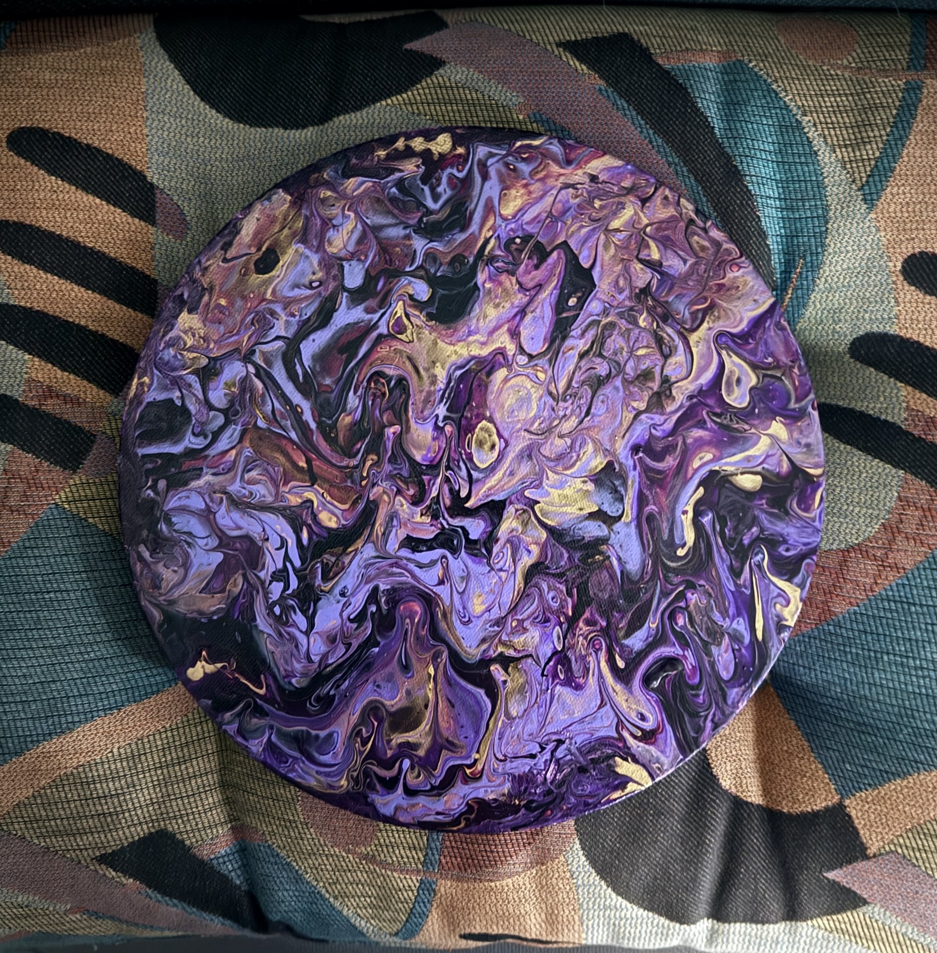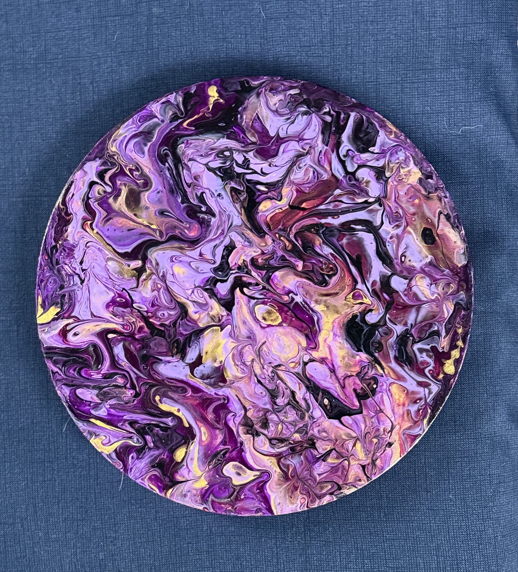 Acrylic abstract art on 10” round gallery wrapped canvas. I had a difficult getting the photos to reflect the real colors used (dark purple, light purple, gold and small amount of black). 1st photo is the truest colors. Painting has been sealed, signed and ready to hang.
