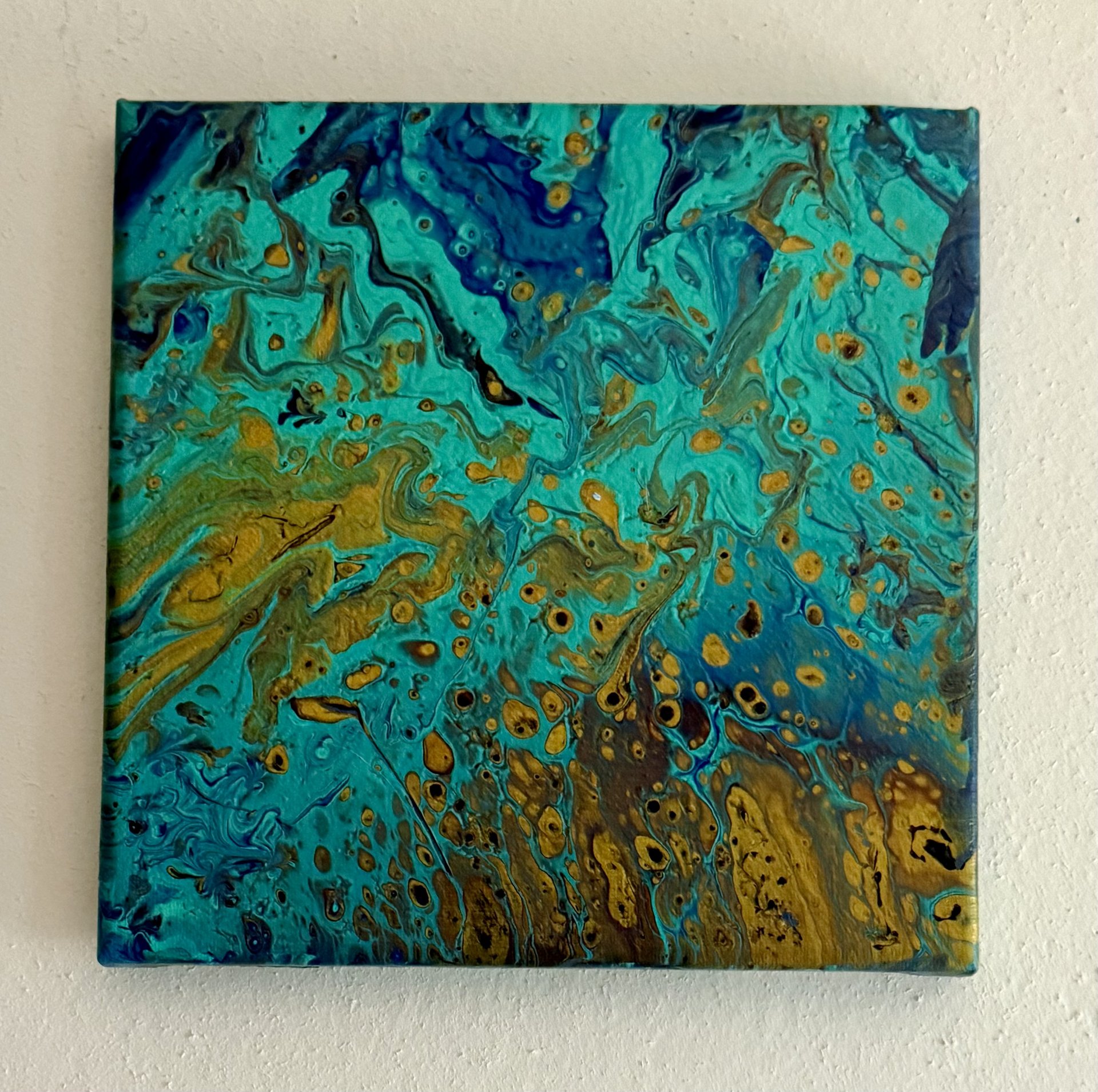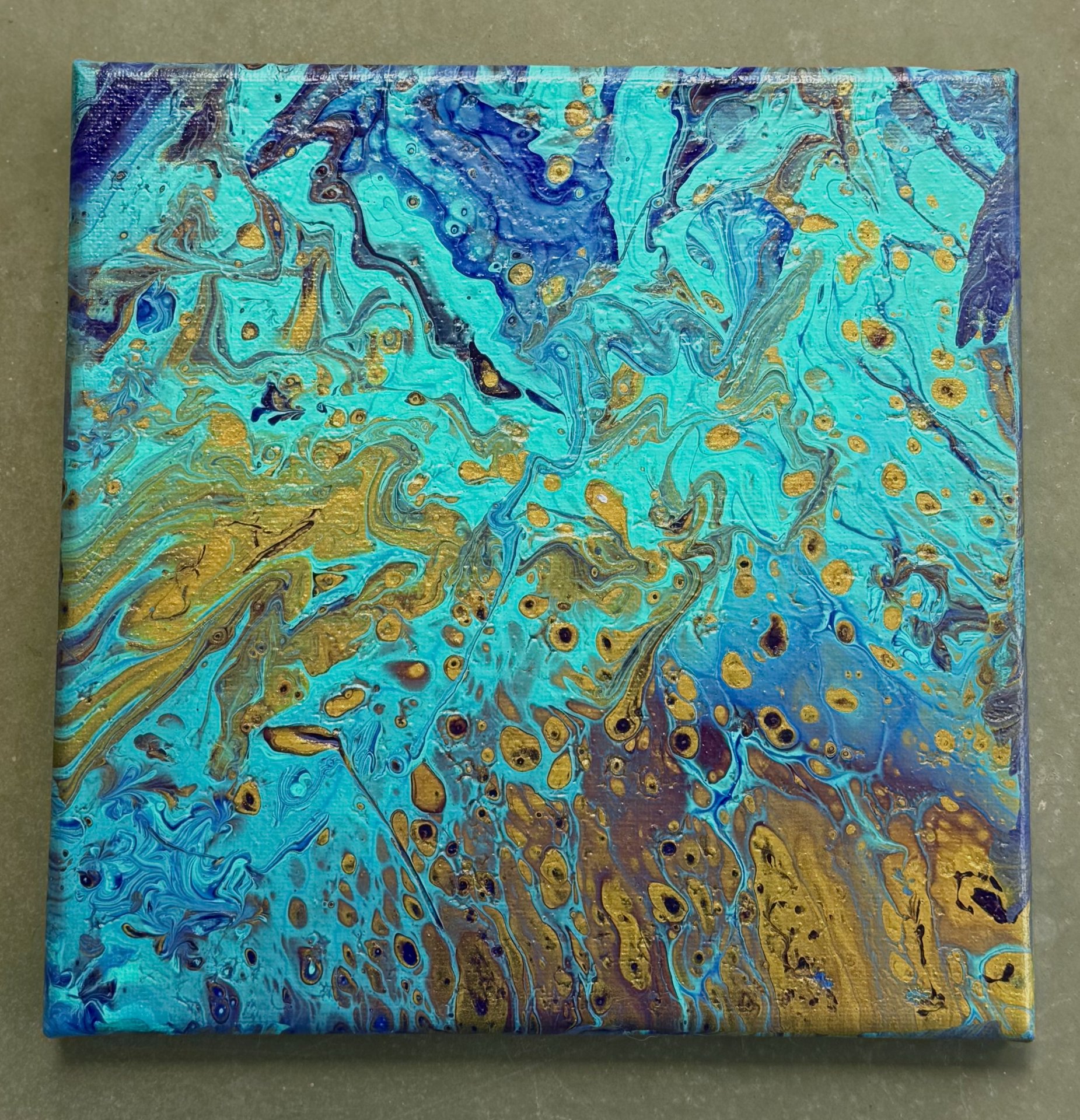 Thinking about warm tropical waters inspired this piece. Acrylic fluid art on 8” x 3/4” square stretched canvas.