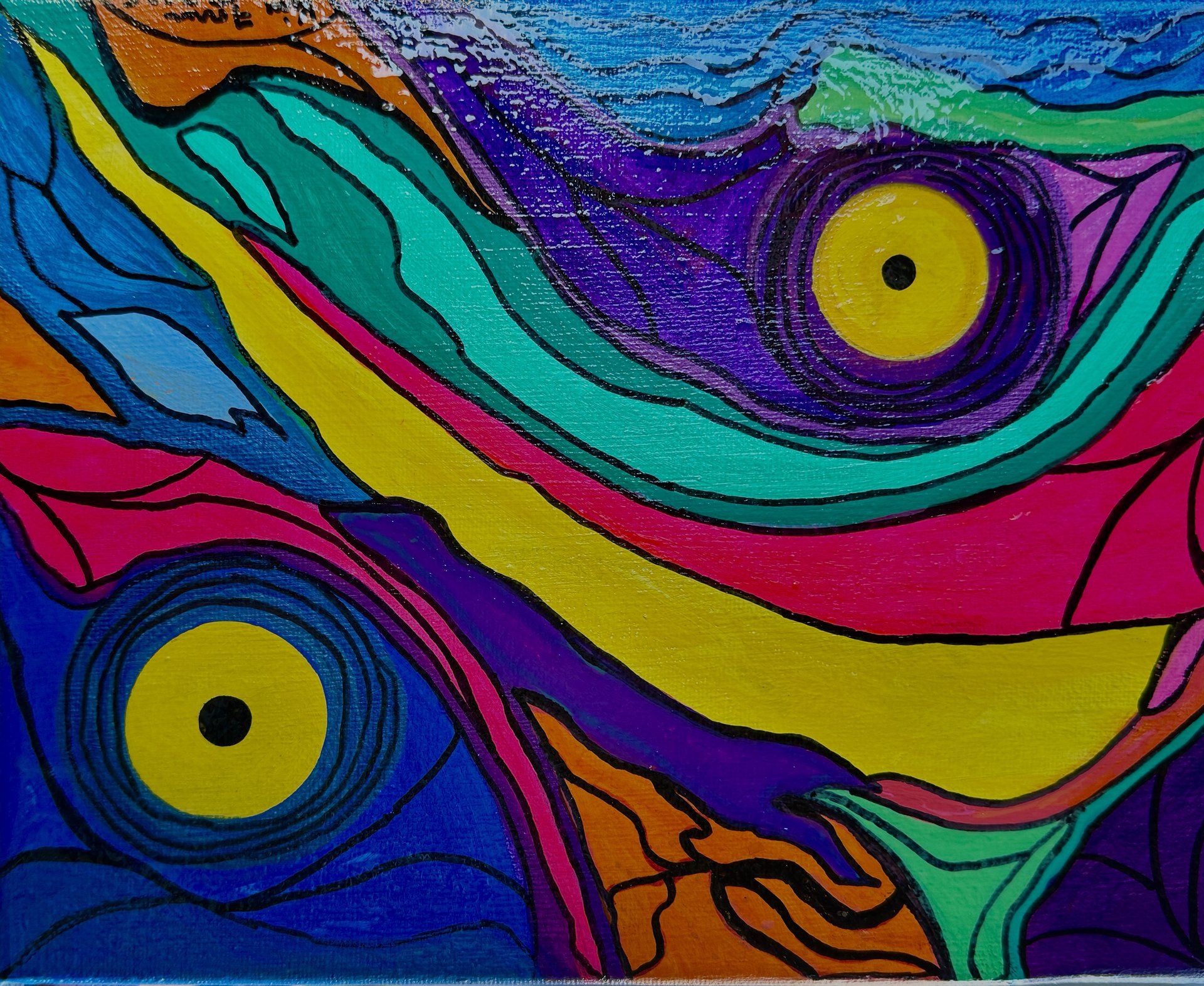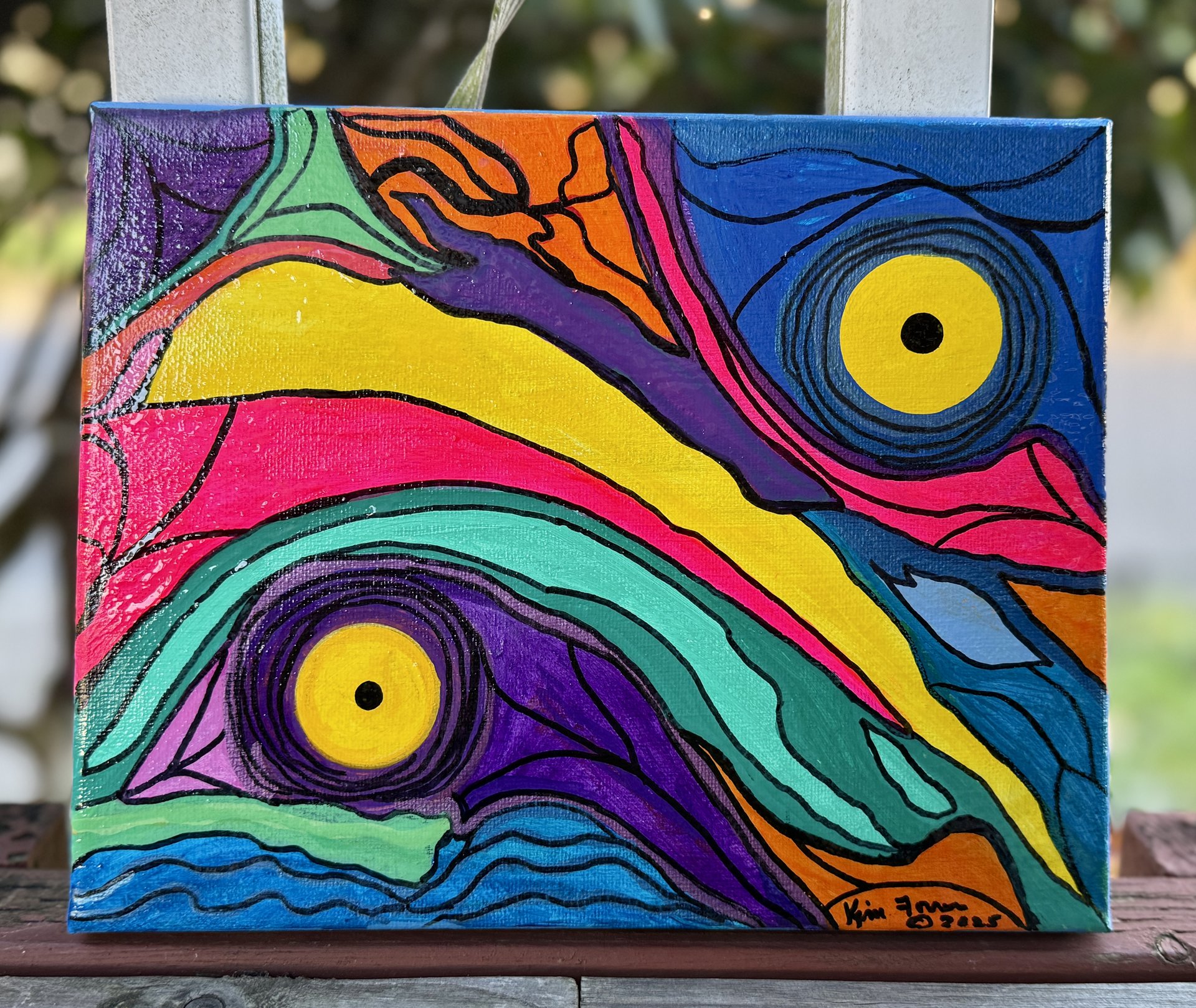 Abstract acrylics on 8” x 10” stretched canvas. Signed, sealed and painted on the sides so she’s ready to hang. Was really needing to paint something different and very colorful! I think this qualifies!