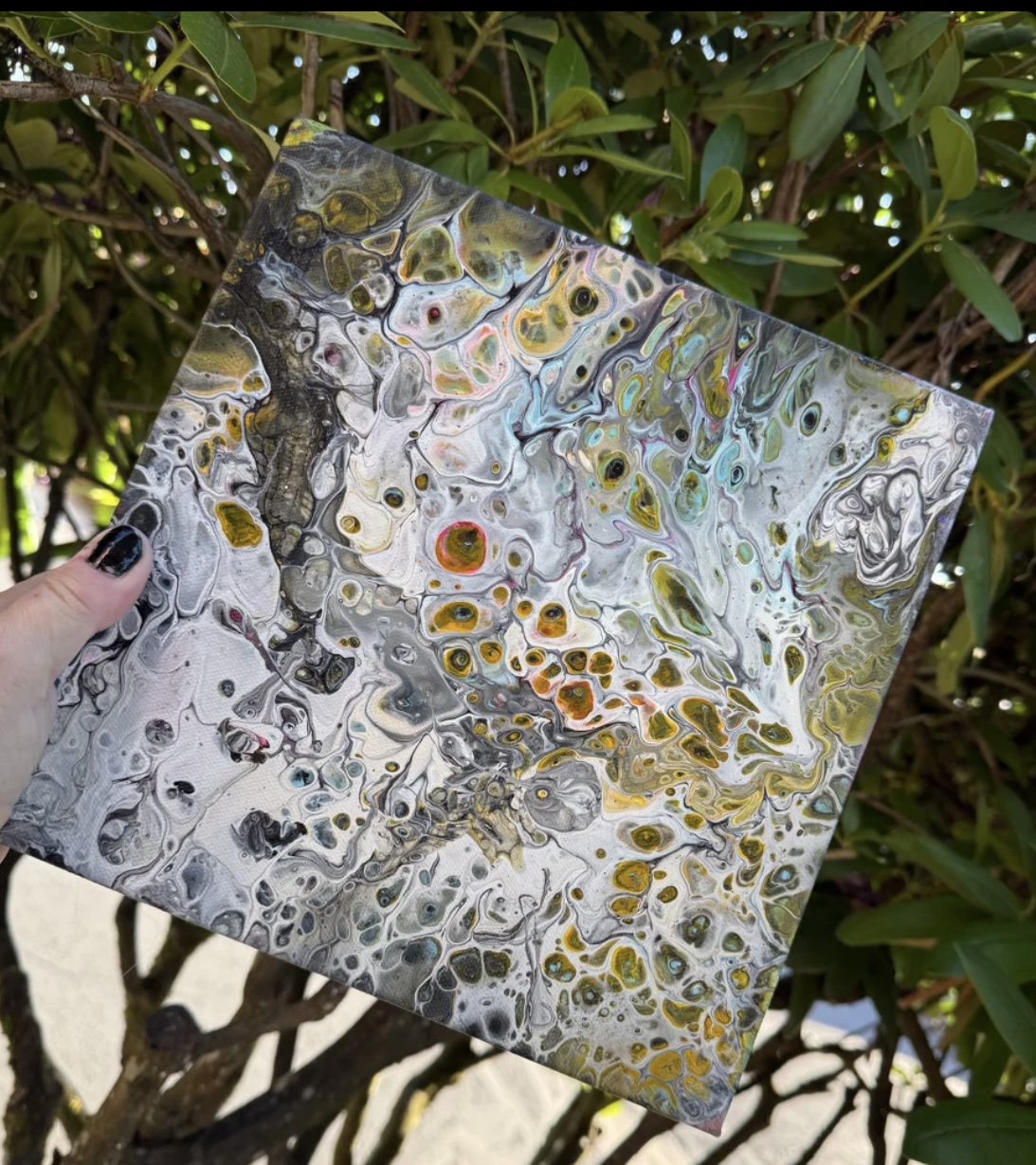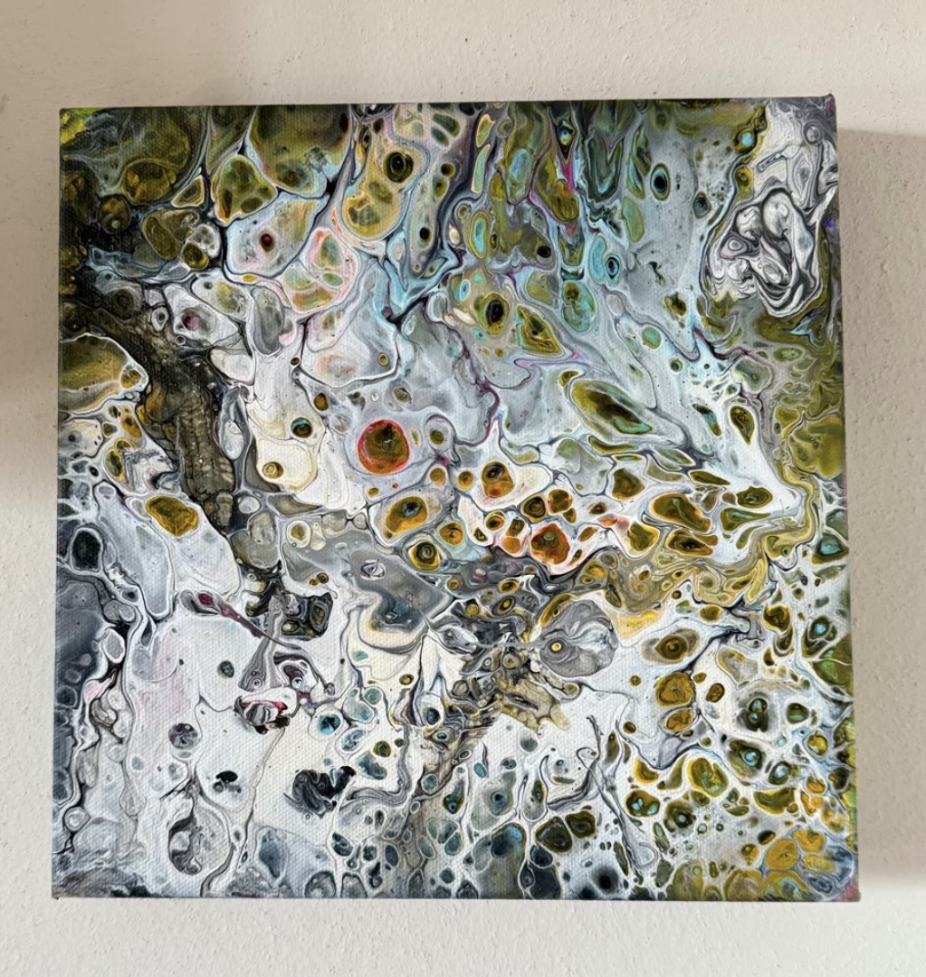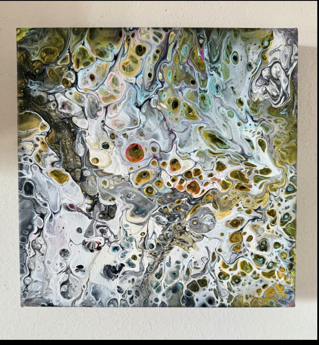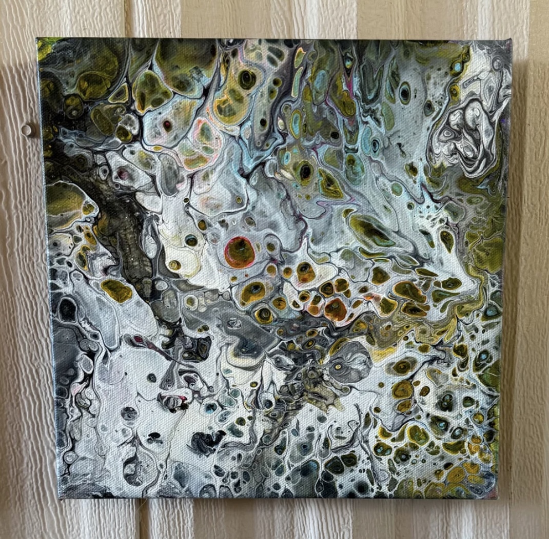 “The Watchers” An acrylic fluid art painting on a 10” square x 1-1/2” gallery wrapped canvas on wood. Lots of “eyes” (cells) in this beauty. You can almost feel them watching your every move. One thing I love about abstracts is you can hang them whatever direction is pleasing to you. Painting is painted on sides so no frame required and signed/dated and gloss sealant for protection.