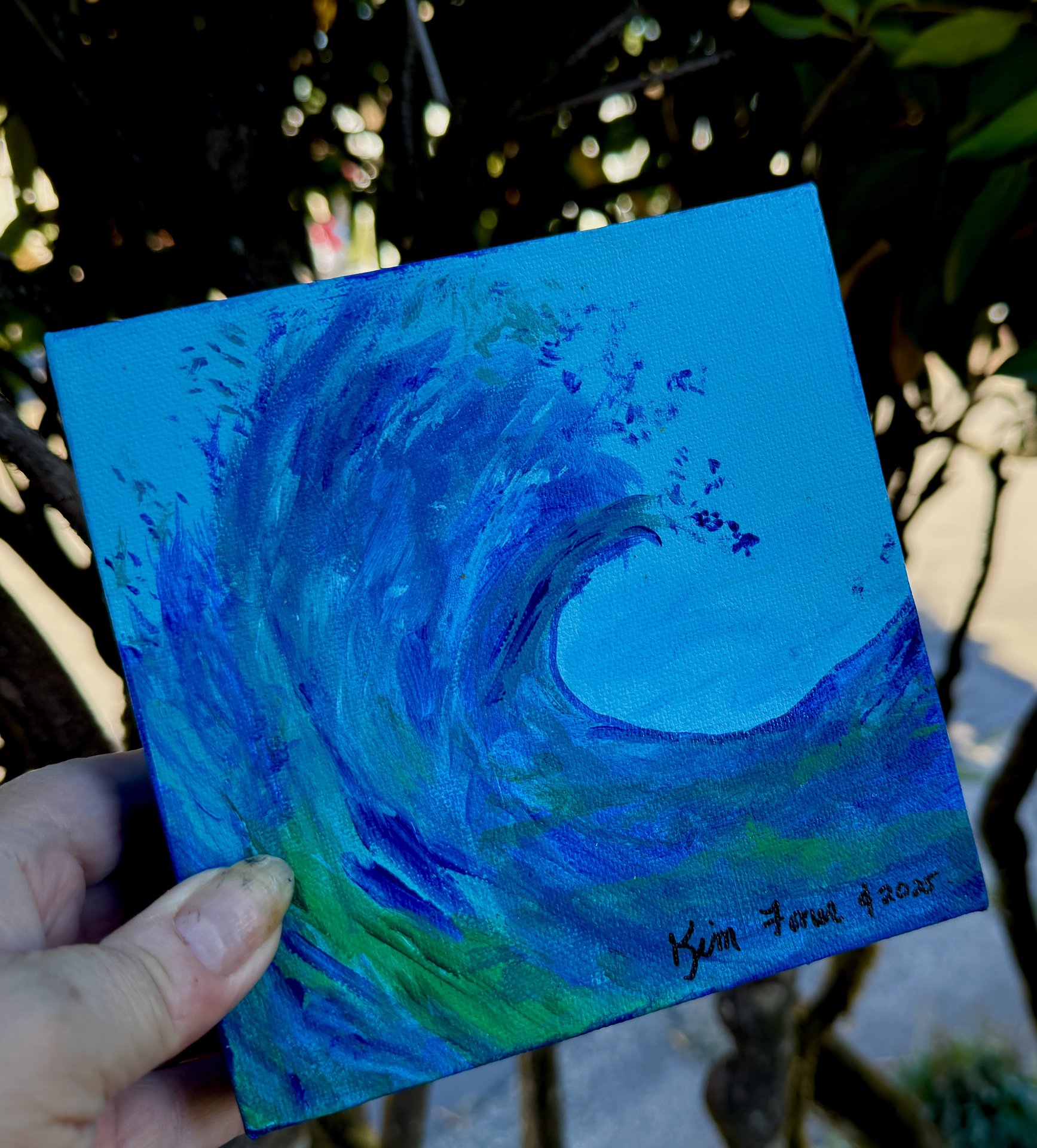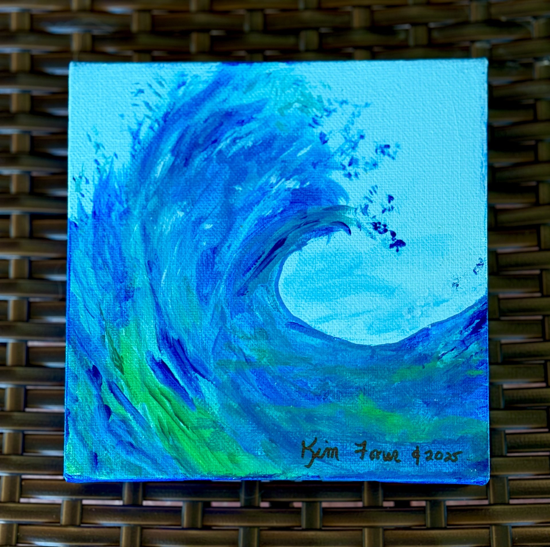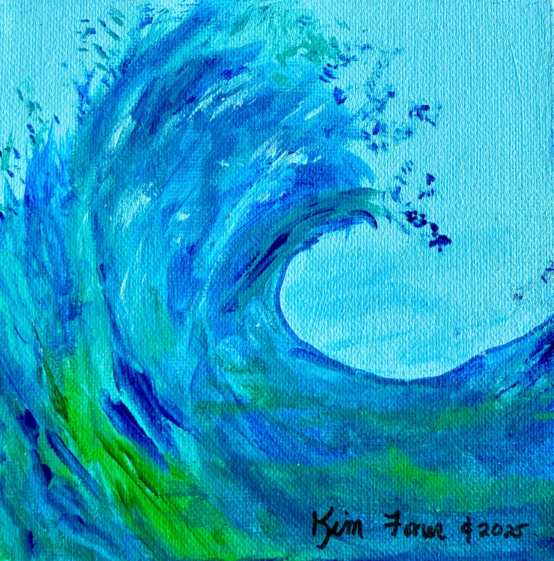 Acrylics on 6” square x 1-1/2” canvas. Perfect for the ocean lovers for that small spot that needs a cool wave painting! Painted on sides so no frame required, sealed and signed.