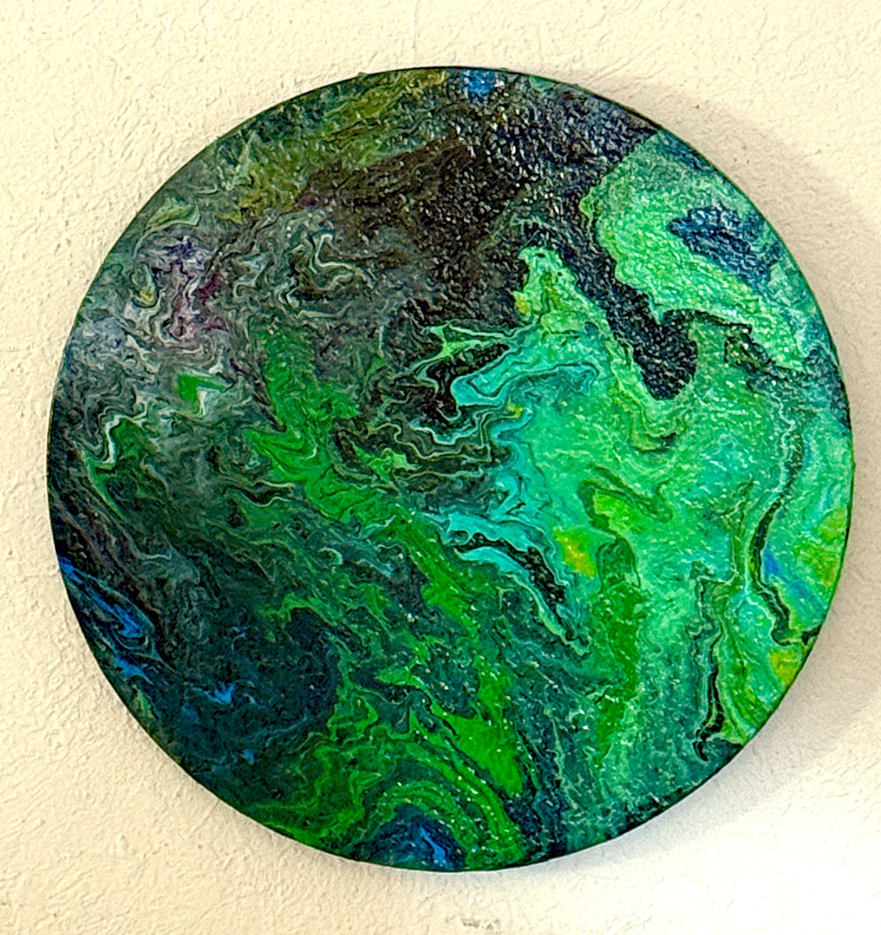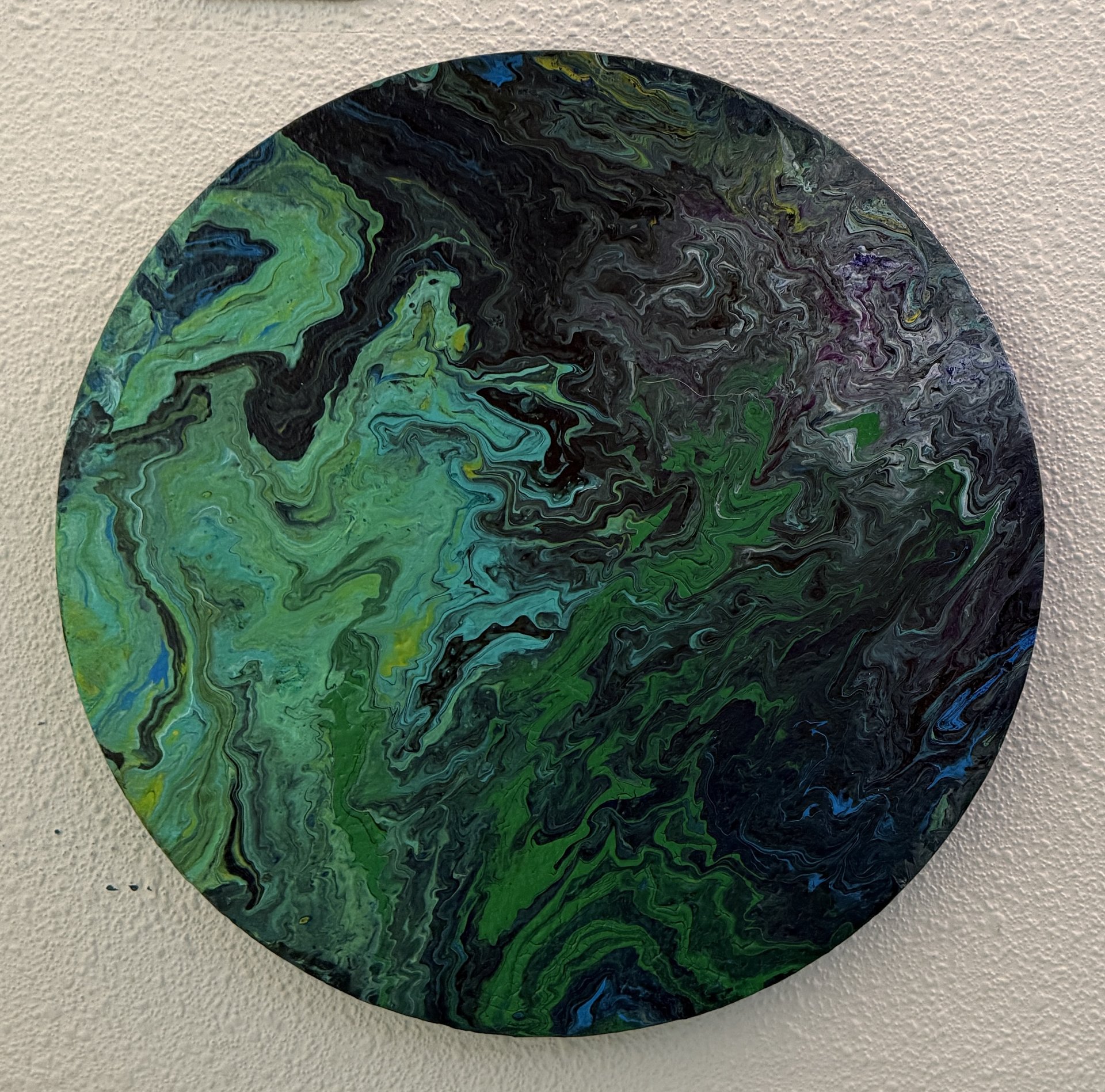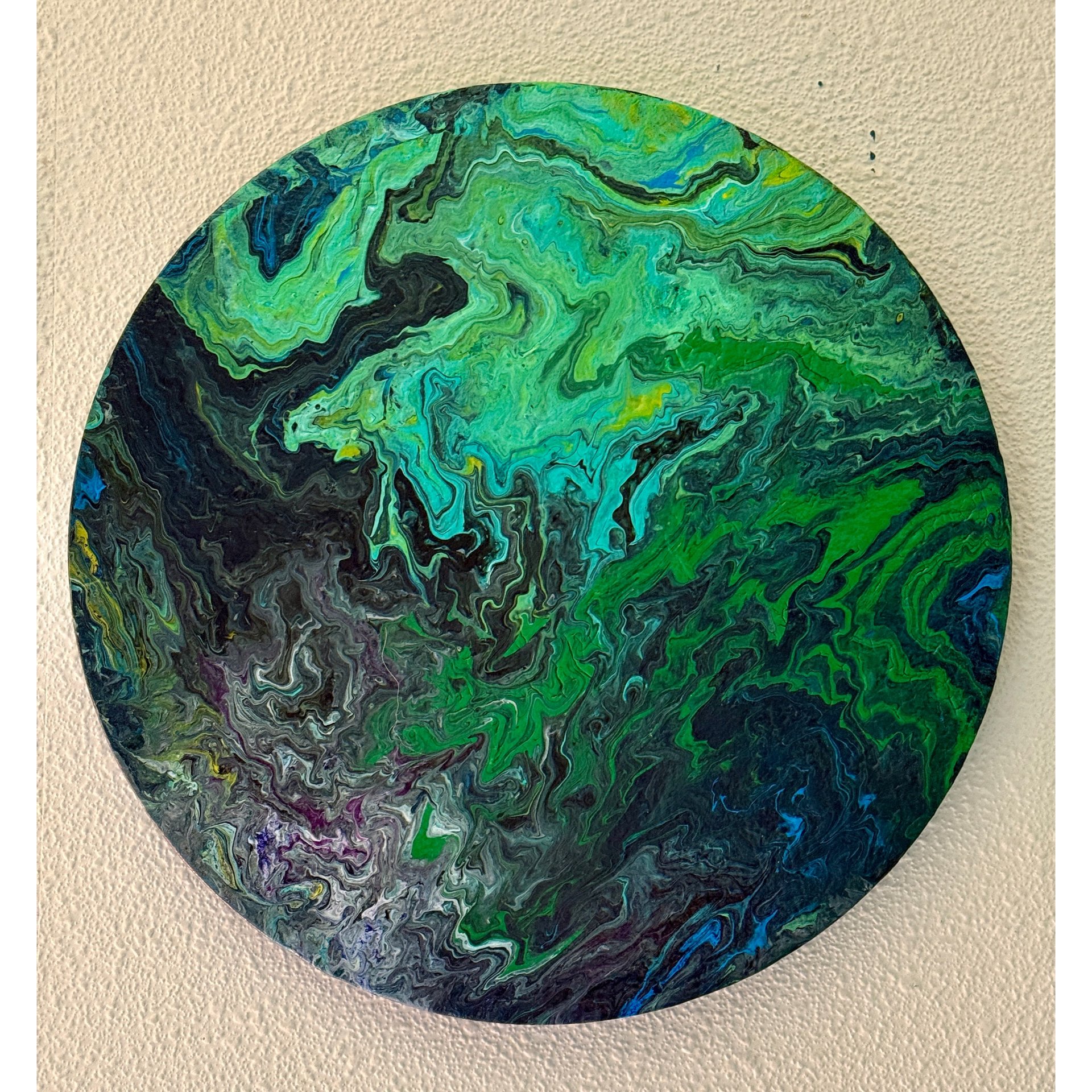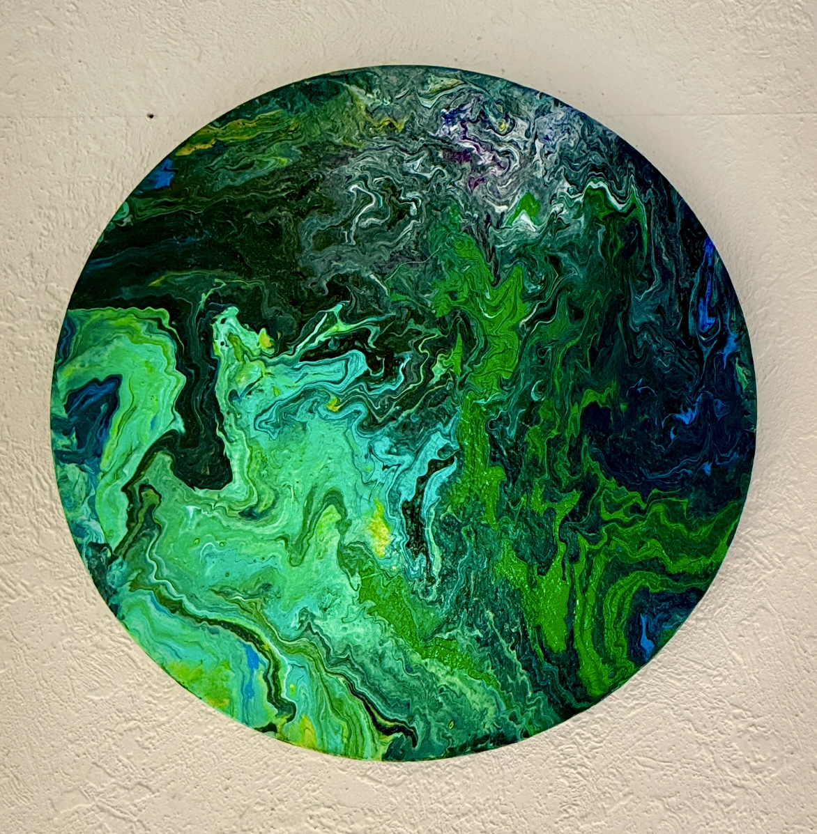 An acrylic fluid pour on 14” round stretched canvas. This actually turned out the way I envisioned. Painted on sides so she’s ready to hang. I think this kinda sums up the way things currently are!